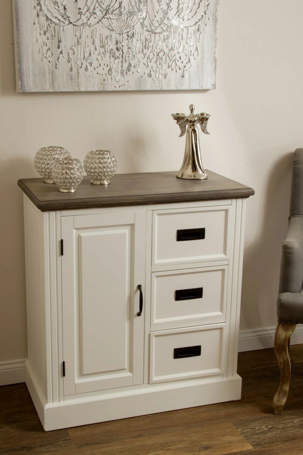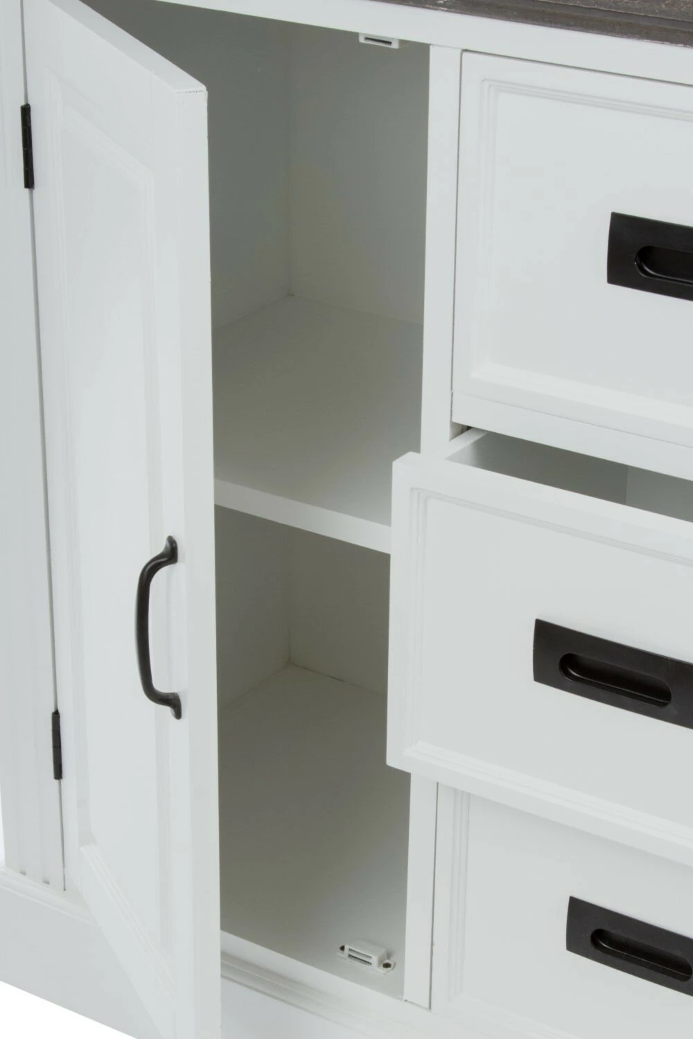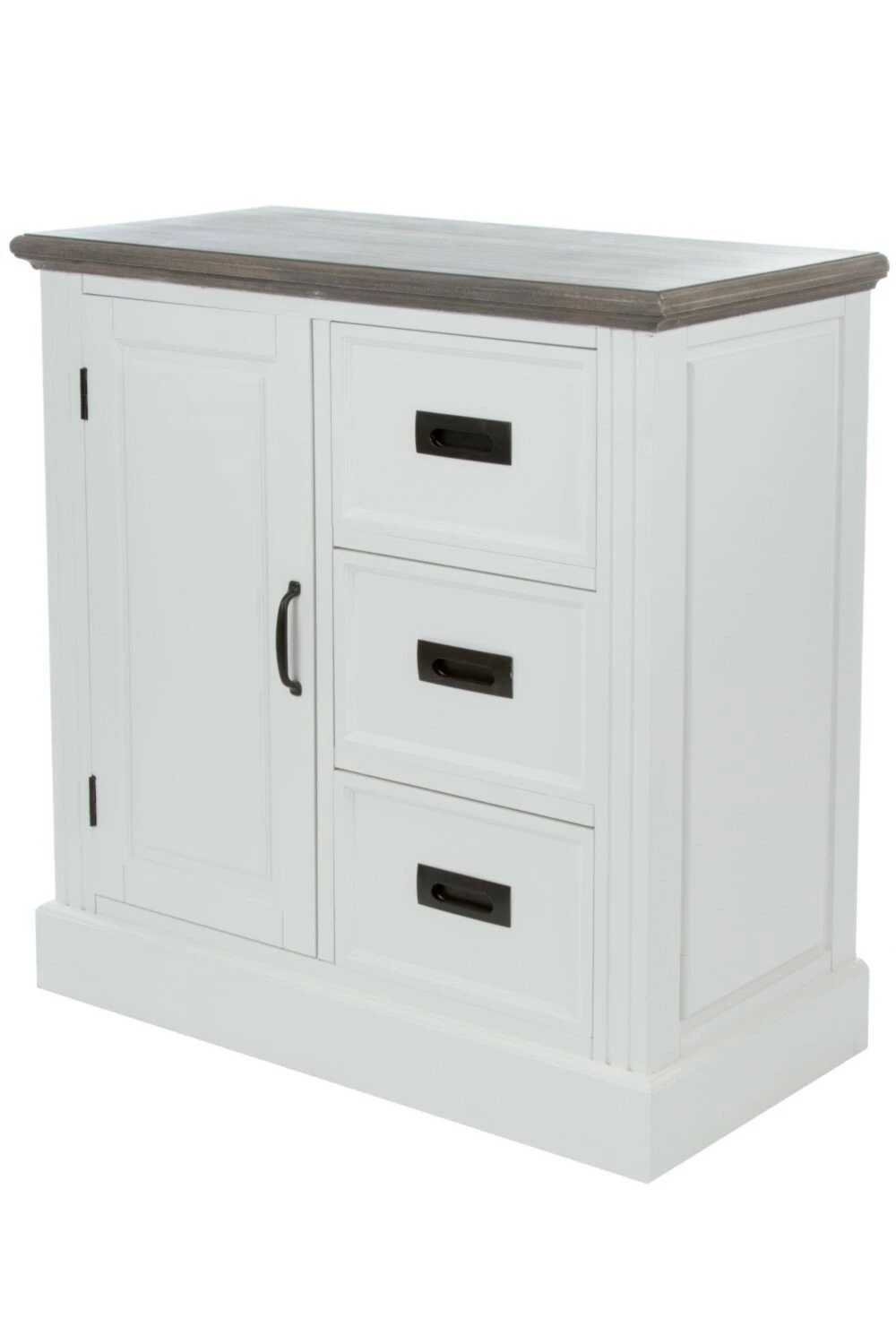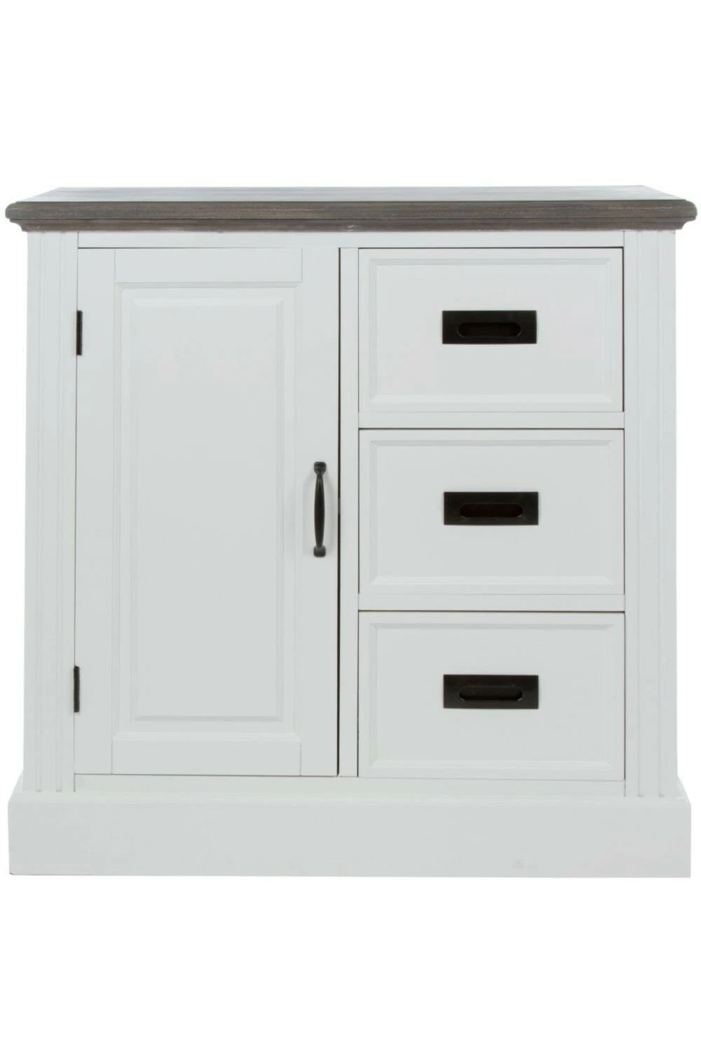 Die Kommode RITA präsentiert sich im Landhausstil und bietet Ihnen in drei Schubkästen und zwei Fächern hinter der Drehtür ausreichend Stauraum für Ihre privaten Gegenstände. Schaffen Sie Ordnung mit Stil und legen sich dieses prachtvolle Möbelstück zu!