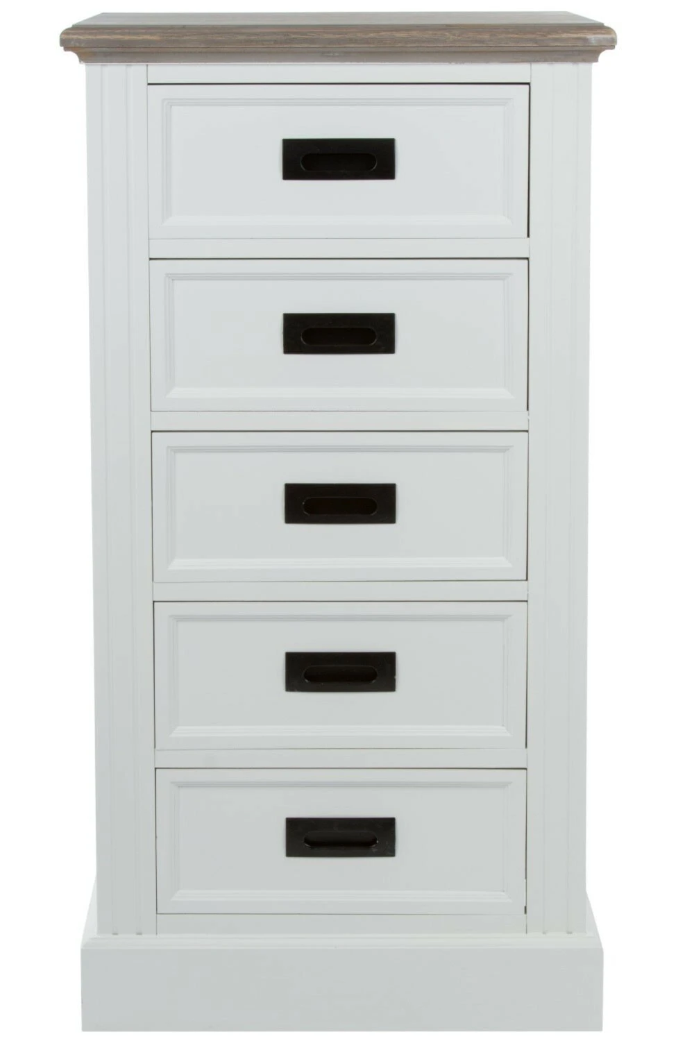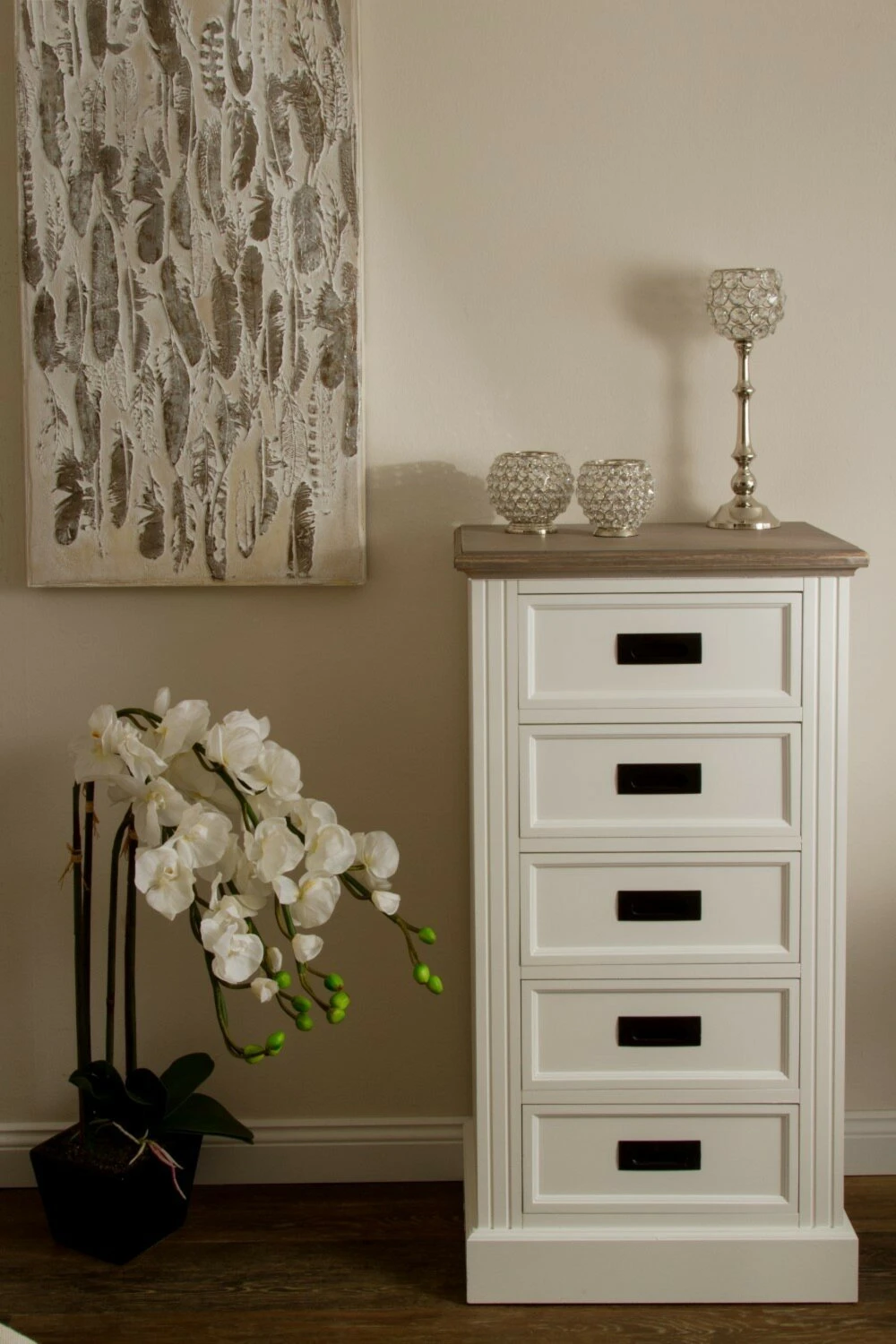 Schöne Kommode im Landhausstil. Fünf Schubkästen stehen Ihnen zum Ordnung halten zur Verfügung. Durch die dezente Farbgebung fügt es sich in viele Wohnräume mit ein.