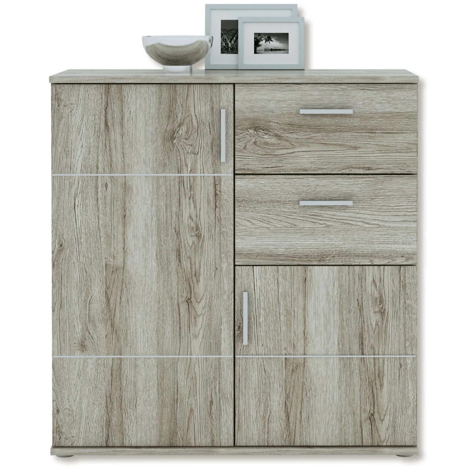 Die Kommode in Sandeiche Nachbildung ist mit zwei Schubkästen, zwei Türen und einem Einlegeboden ausgestattet. So bietet Ihnen diese Kommode viel Stauraum und begeistert zudem mit wohnlichem Design. Egal ob im Wohnzimmer, Schlafzimmer oder der Diele – die Kommode lässt sich wunderbar vielseitig in Ihren Einrichtungsstil integrieren.