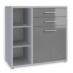 Wunderschöne Kommode mit Schubladen und Türen in einem Mix aus aus Platingrau und Grauglas. In diesem Möbelstück können Sie ganz praktisch und übersichtlich Ihre Büro- oder andere Utensilien aufbewahren. Die Melaminharzbeschichtung verhindert Kratzer auf der Oberfläche und mit ABS-Kanten ist der Schrank langfristig vor Abnutzungserscheinungen geschützt.