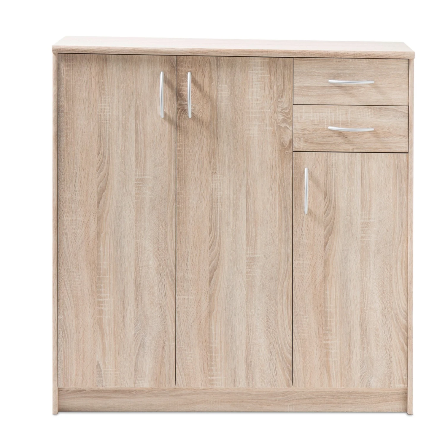 Die Kommode in schicker Sonoma Eiche Nachbildung ist besonders praktisch aufgeteilt. Hinter den beiden großen Türen auf der linken Seite befinden sich drei Einlegeböden, die den Innenraum in vier geräumige Fächer aufteilen. Hinter der kleineren Tür auf der rechten Seite teilen insgesamt zwei Einlegeböden den Innenbereich ideal auf. Zudem gibt es zwei Schubfächer und die obere Ablagefläche eignet sich sehr gut für Dekorationszwecke.