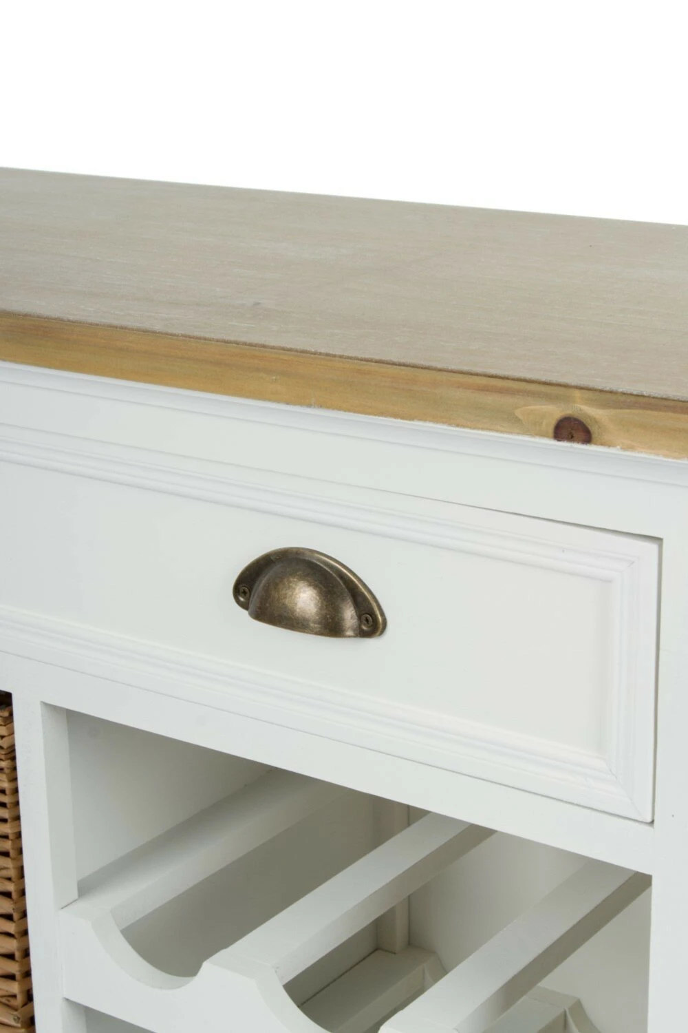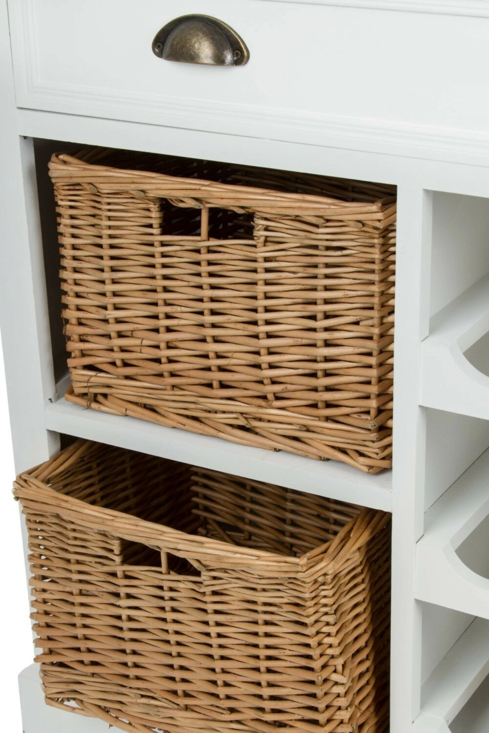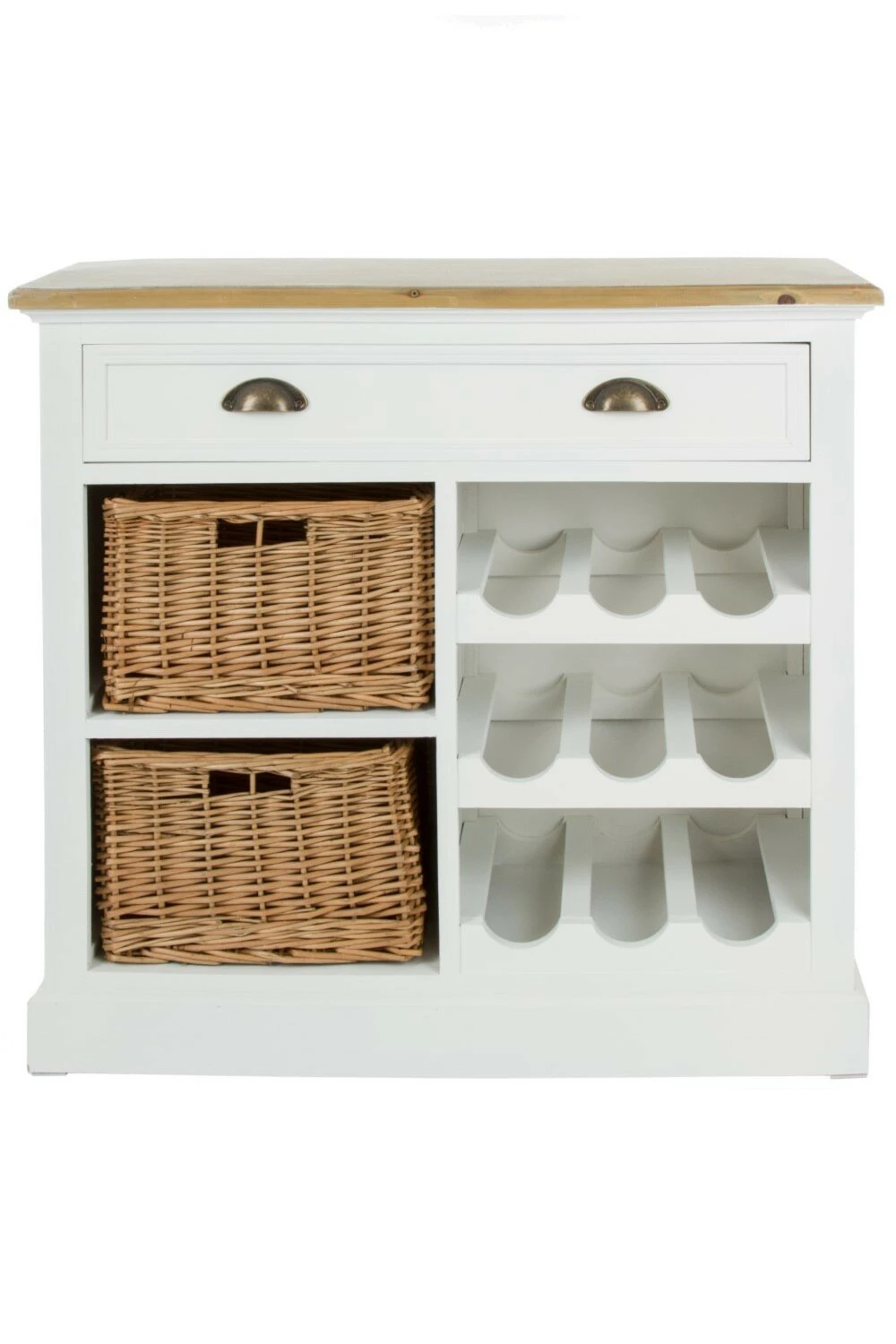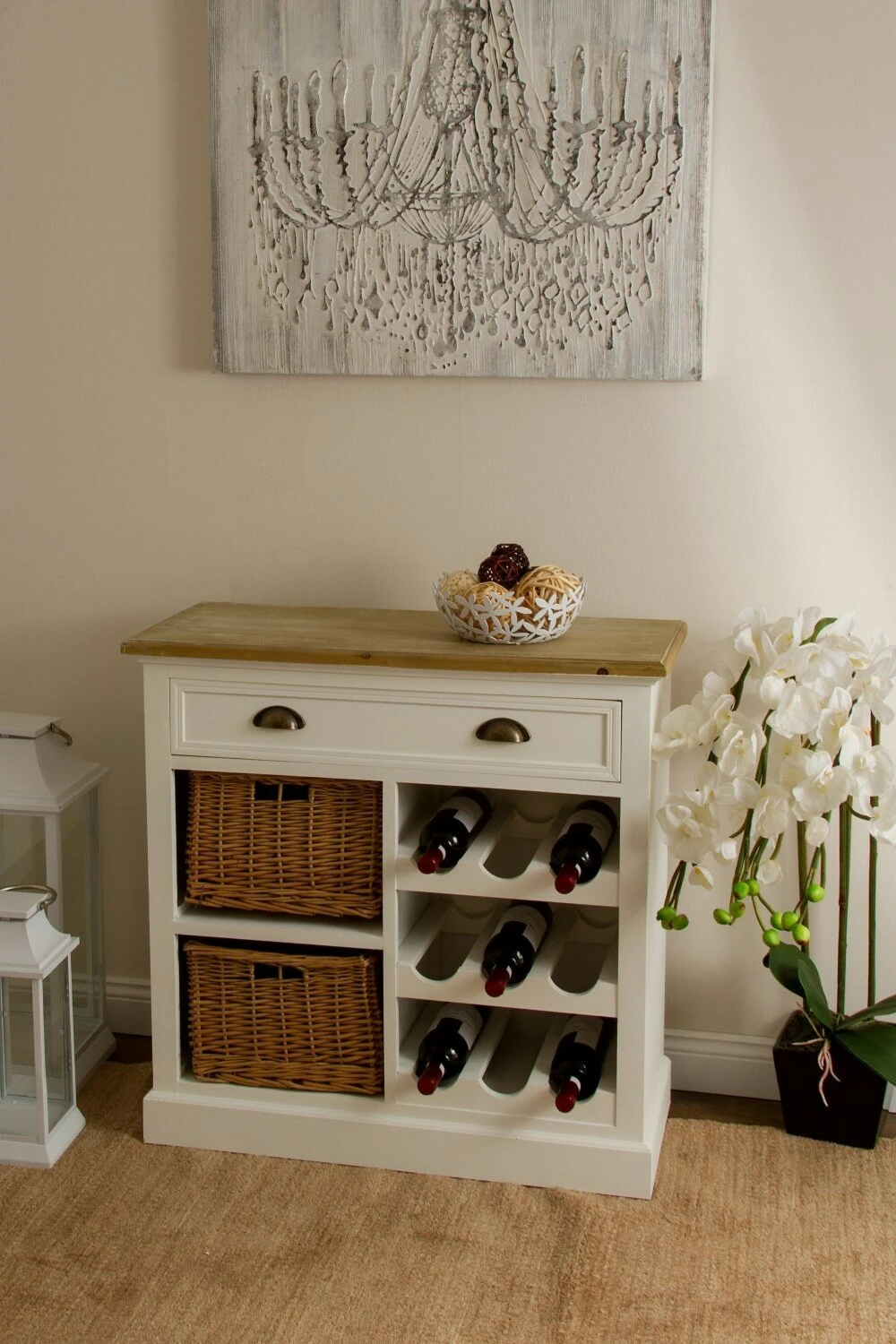 Die Kommode TOSCANA ist mit drei Weinablagen ausgestattet, in denen insgesamt neun Flaschen platziert werden können. Weiteren Stauraum finden Sie in den beiden Rattan-Körben, sowie im vorhandenen Schubkasten, in dem Sie kleinere Gebrauchsgegenstände unterbringen können. Kombinieren Sie diese Kommode mit anderen Landhausstil-Möbeln und schaffen Sie Individualität in Ihren Räumlichkeiten.