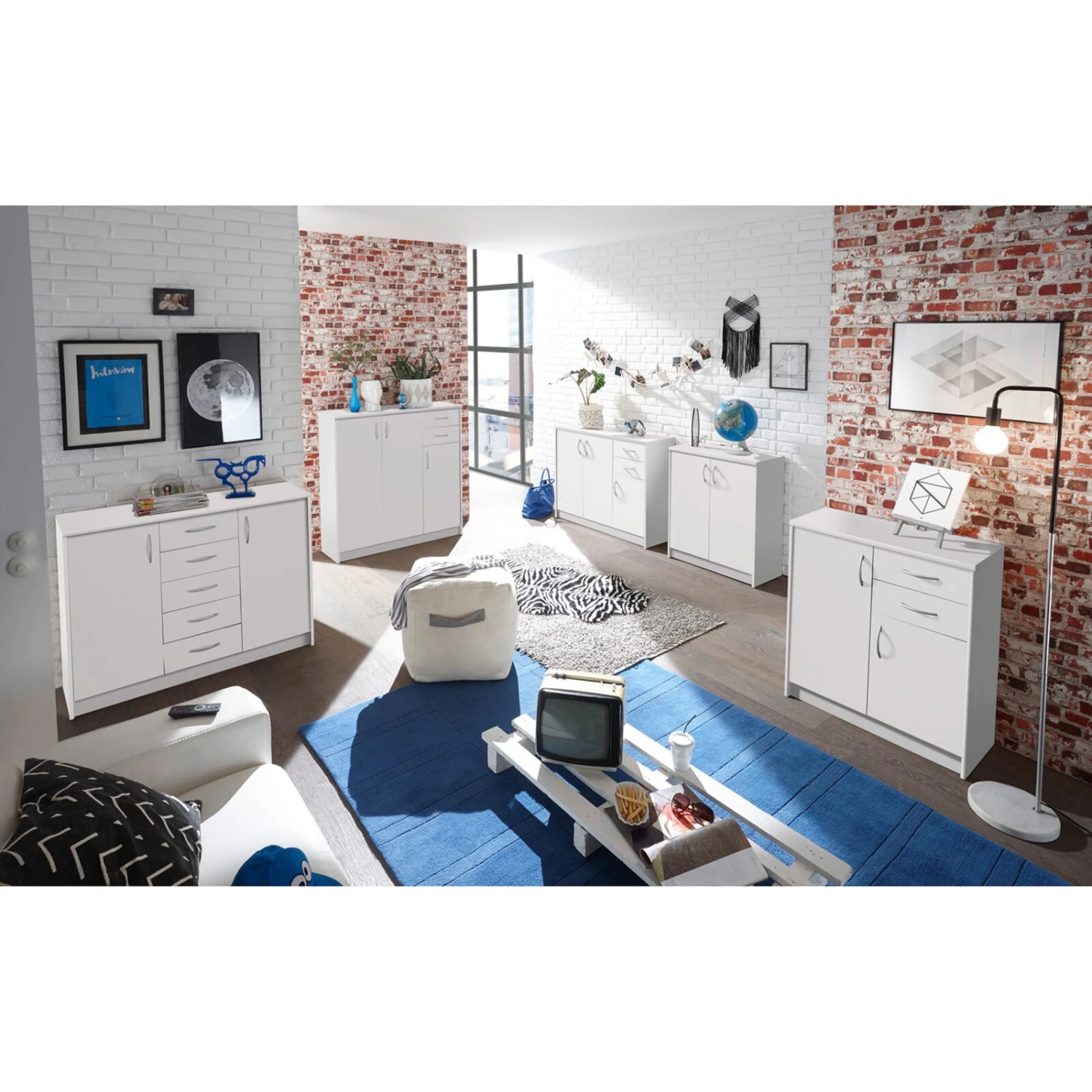 Die Kommode in Weiß ist ein echter Hingucker für Ihren Raum. Zudem bietet die Kommode viel Stauraum für die unterschiedlichsten Dinge, wie beispielsweise Büromaterialien oder Dekoration. Die beiden Türen lassen sich mit alufarbenen Kunststoffgriffen öffnen.