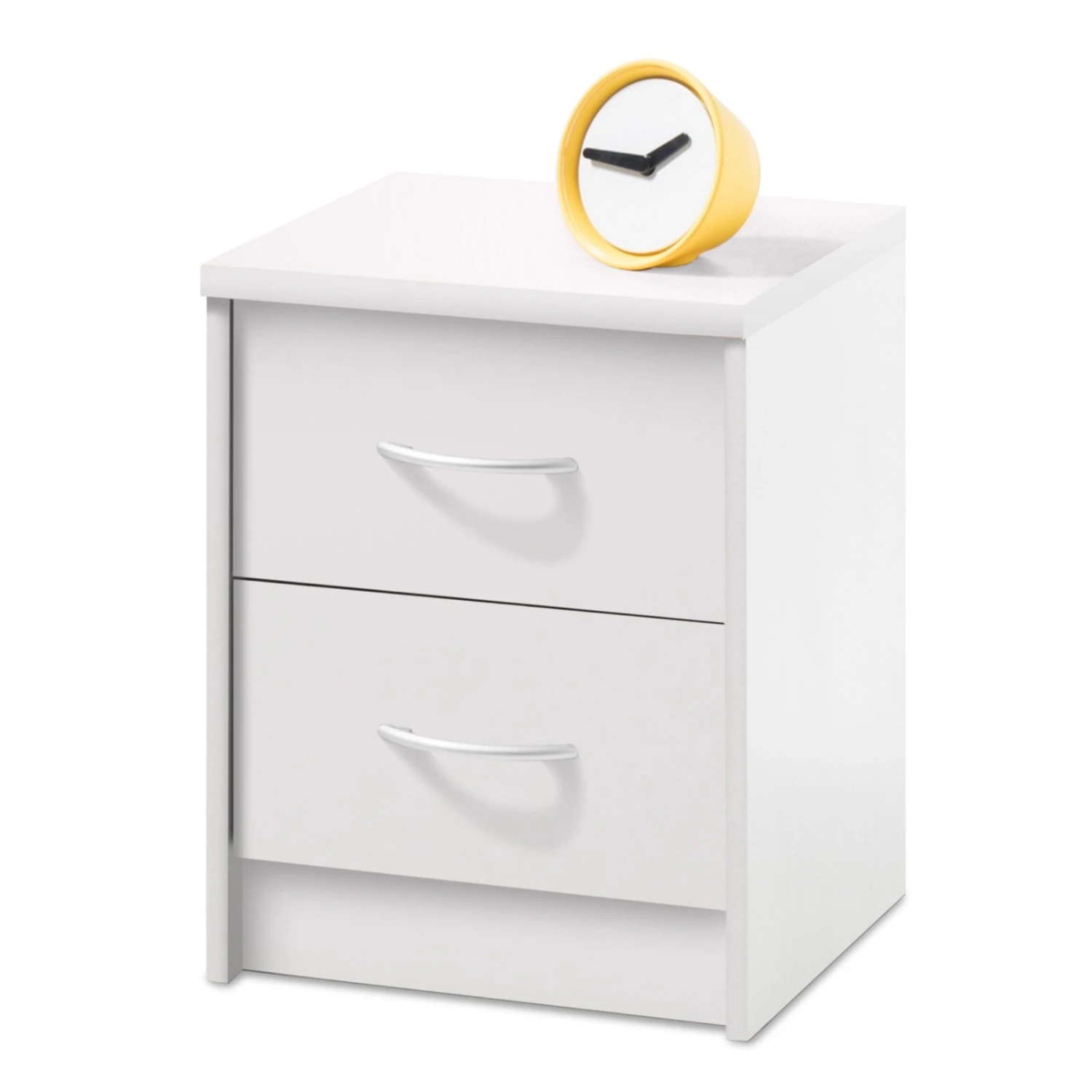 Diese Kommode präsentiert sich in einem zeitlosen Weiß und verfügt über aluminiumfarbene Griffe. Die beiden Schubkästen bieten den nötigen Stauraum für Ihre Utensilien.