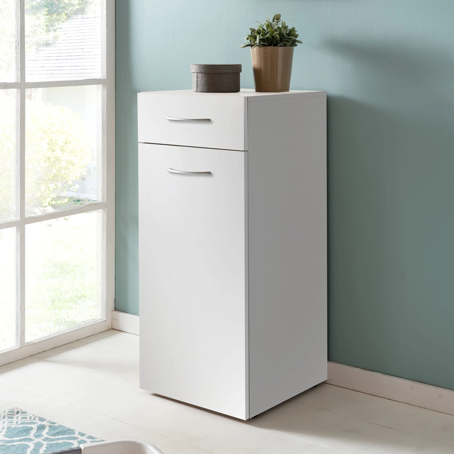 Die Kommode ist aus weiß foliertem Holz und ist mit einer praktischen Schublade und einer Wäschebox ausgestattet. Die silberfarbenen Griffe sind aus Kunststoff.