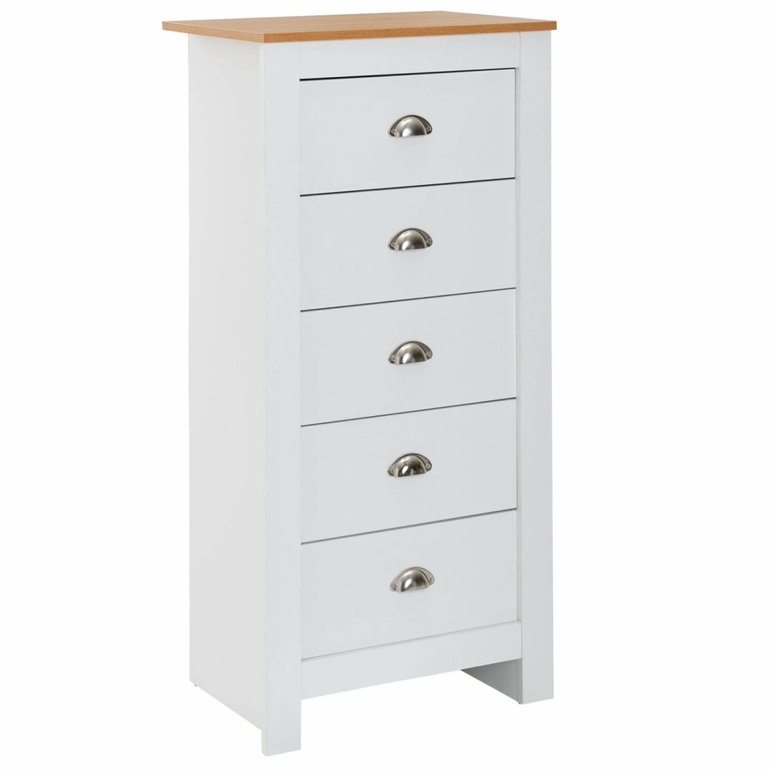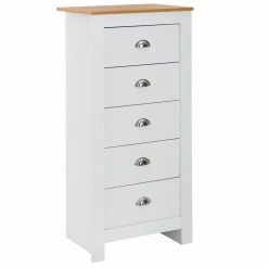 Sie haben wenig Platz in der Wohnung, aber brauchen dennoch Aufbewahrungsmöglichkeiten? Dann ist diese Kommode die passende Lösung! Es ist mit fünf Schubkästen ausgestattet und bietet Ihnen somit ausreichend Platz für diverse Gegenstände. Dank des schlanken Designs nimmt diese Kommode nicht viel Platz ein.