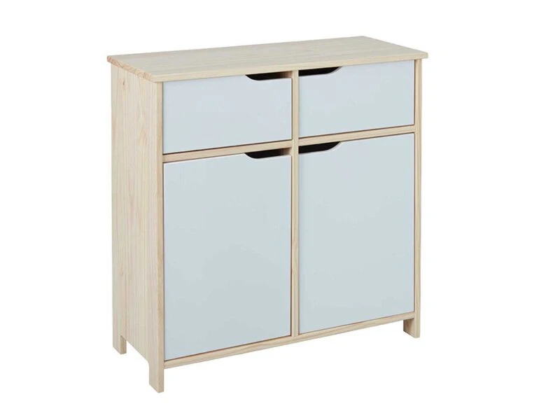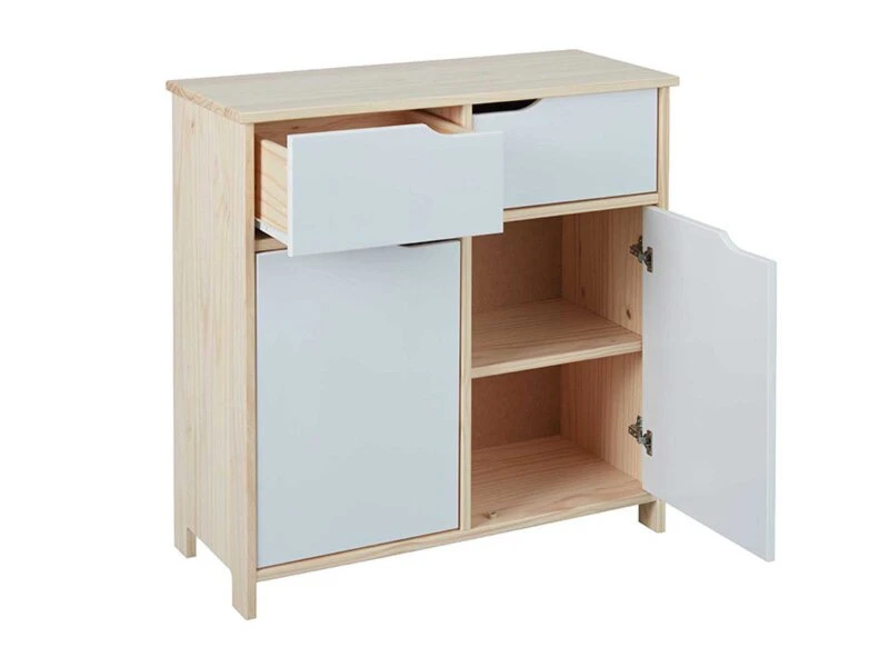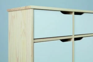 Der Korpus dieser Kommode ist mit leicht weiß eingefärbter Farbe lackiert worden, wodurch eine Art Milchschimmer entsteht. Dieser Milchschimmer heißt Milkyskin und ist der neuste Oberflächentrend. Die Massivholzmaserungen kommen durch den Milchschimmer besonders schön zur Geltung. Die Kommode verfügt über zwei Drehtüren und zwei Schubkästen. Die Griffmulden und die weißen Fronten runden das moderne, skandinavische Design ab.