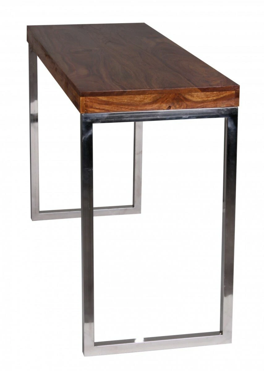 Egal ob als Schreib- oder Schminktisch, dieser Konsolentisch wird in jedem Fall eine hervorragende Figur machen. Die große Tischplatte misst 120 x 45 cm und bietet somit reichlich Ablagefläche für die verschiedensten Utensilien. Das massive Sheeshamholz und das chromfarbene Metallgestell sorgen für eine stabile Konstruktion.