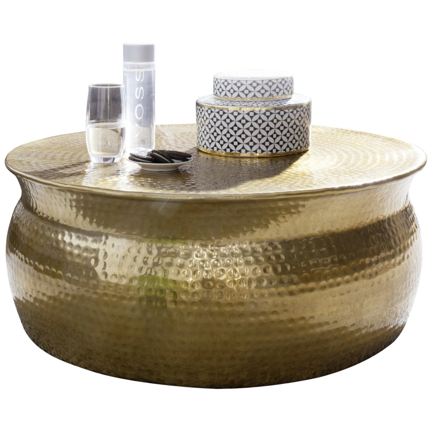 Gold ist sehr angesagt und versprüht ein tolles Ambiente. Durch das Hammerschlagmuster erhielt der runde Tisch seinen ganz eigenen Charakter. Er wertet jeden Raum optisch auf und bringt einen Schwung Eleganz mit.