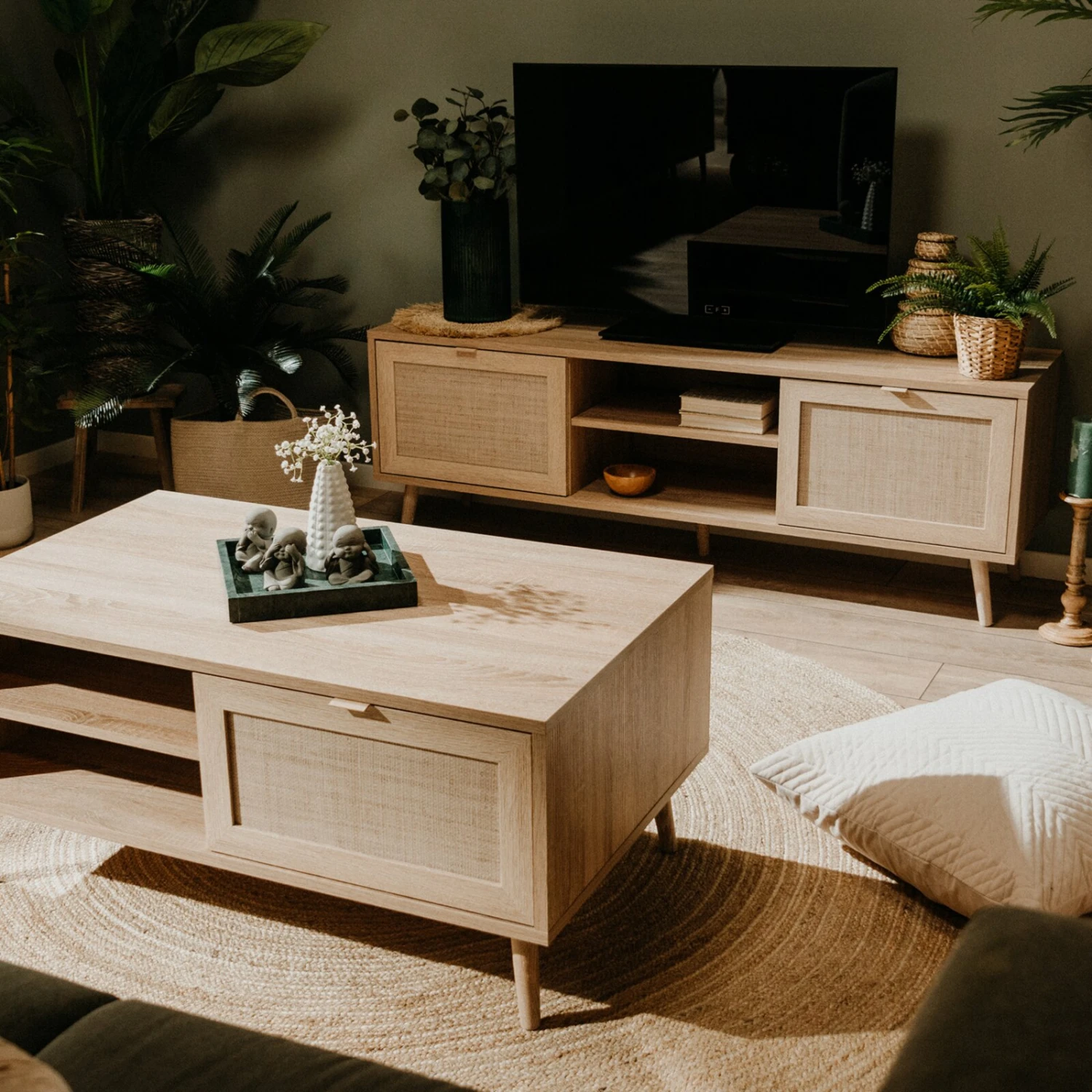 Lowboard BALI – Sonoma Eiche-Rafia geflecht – 150 cm breit