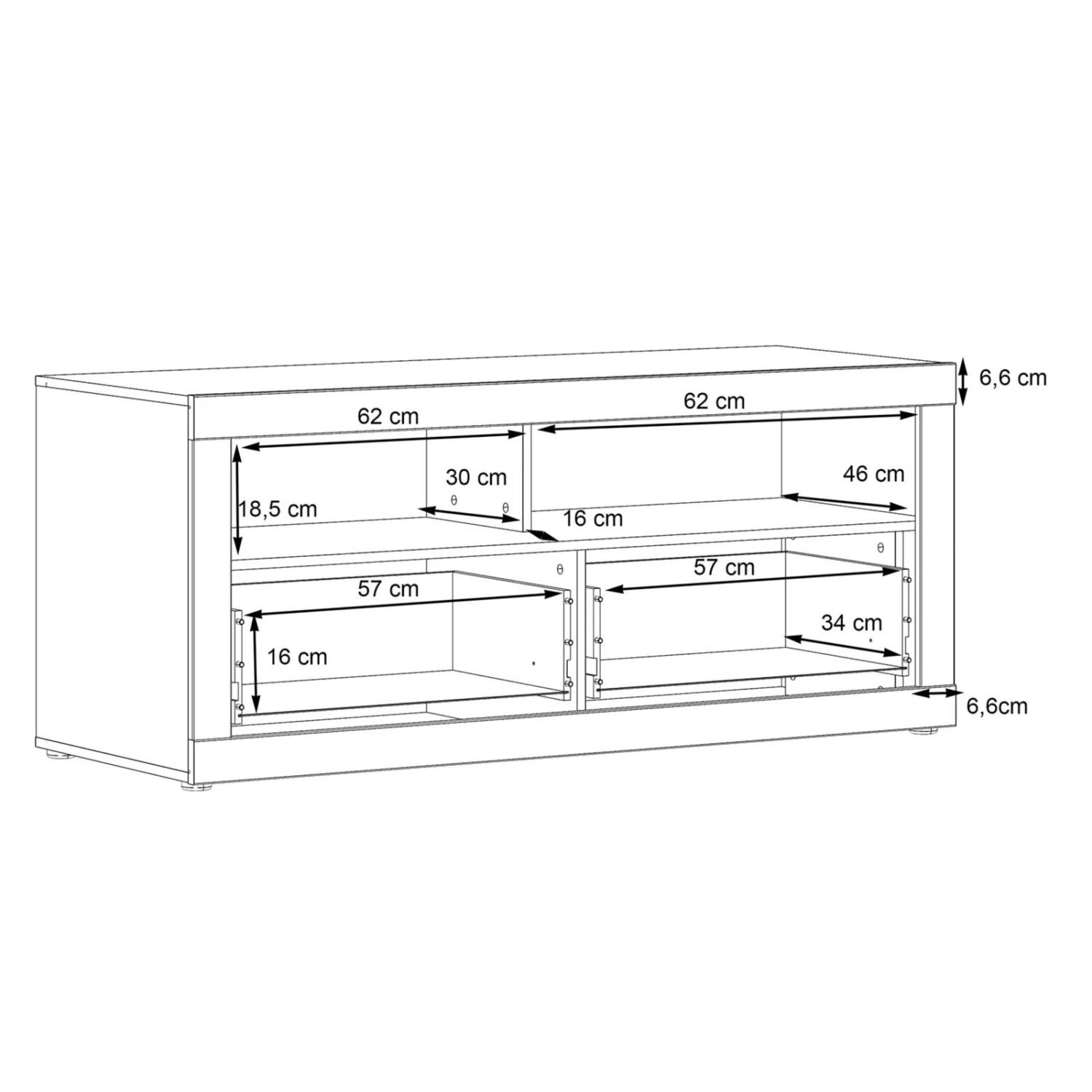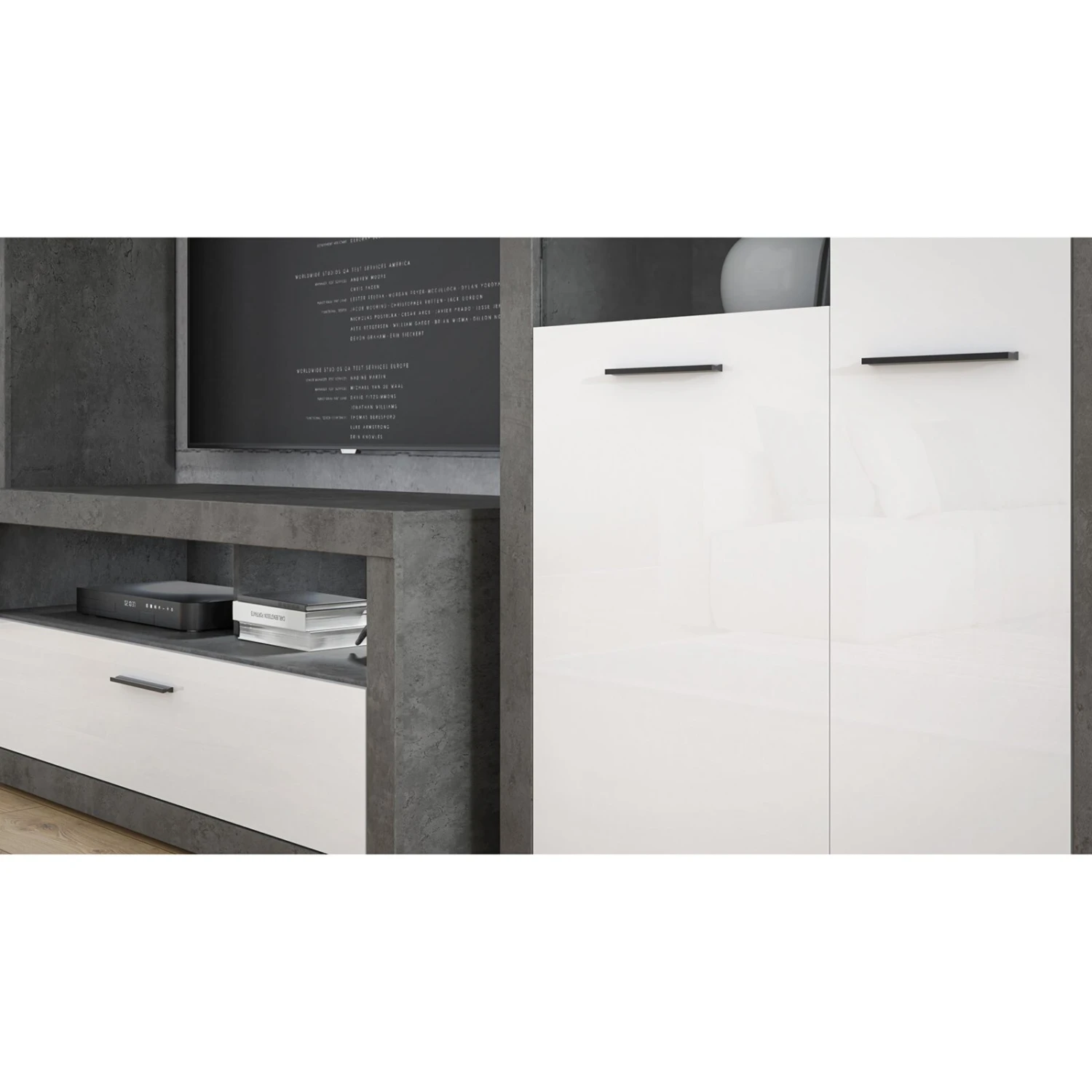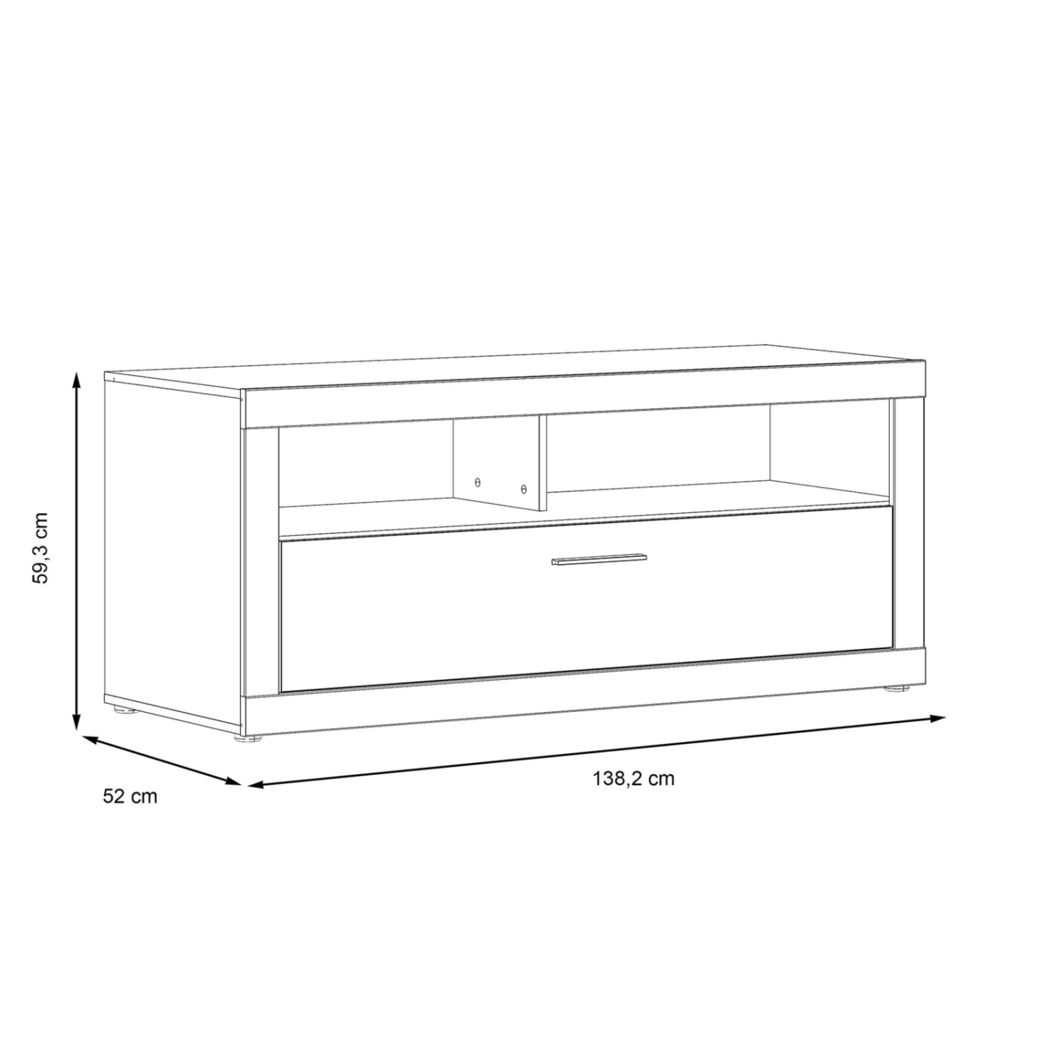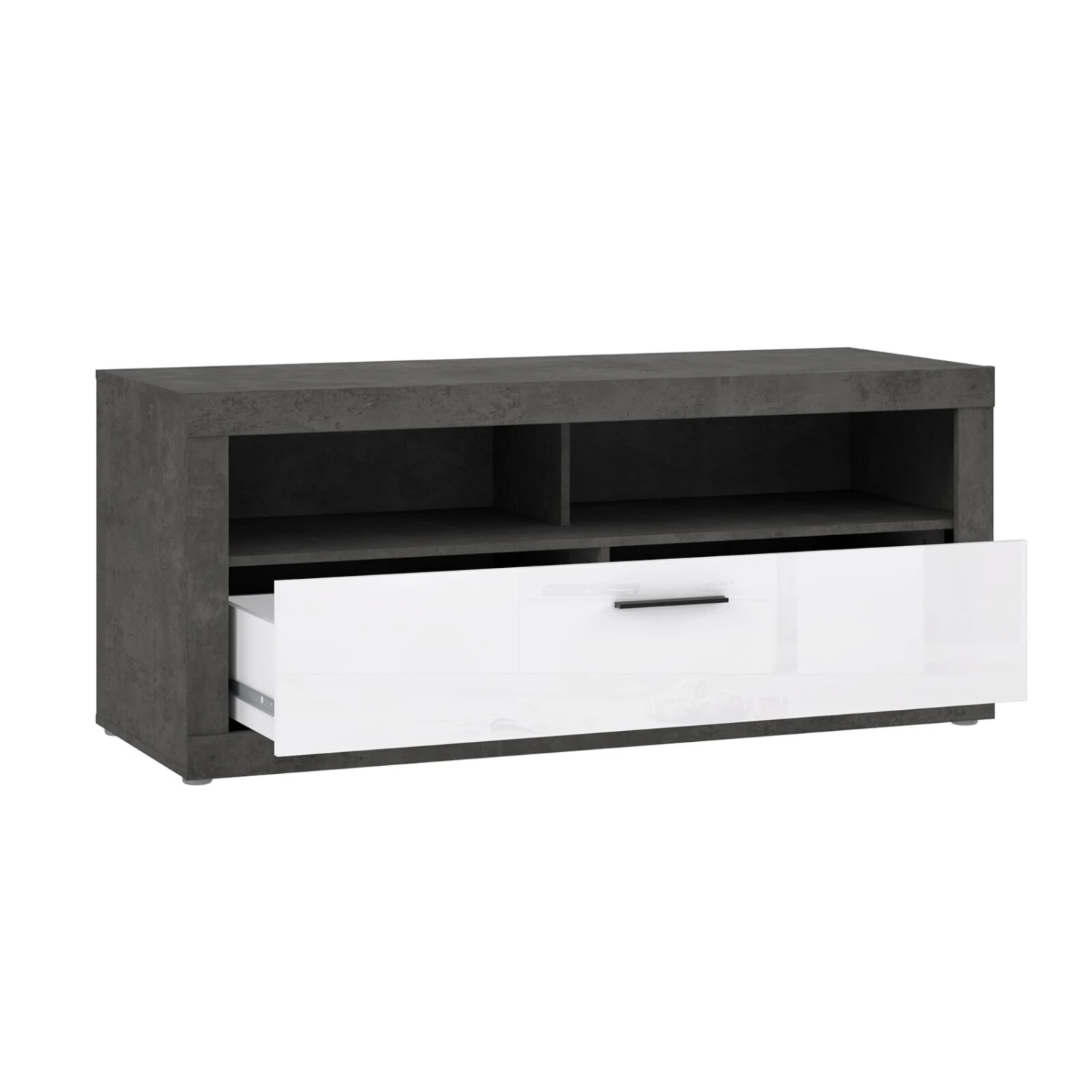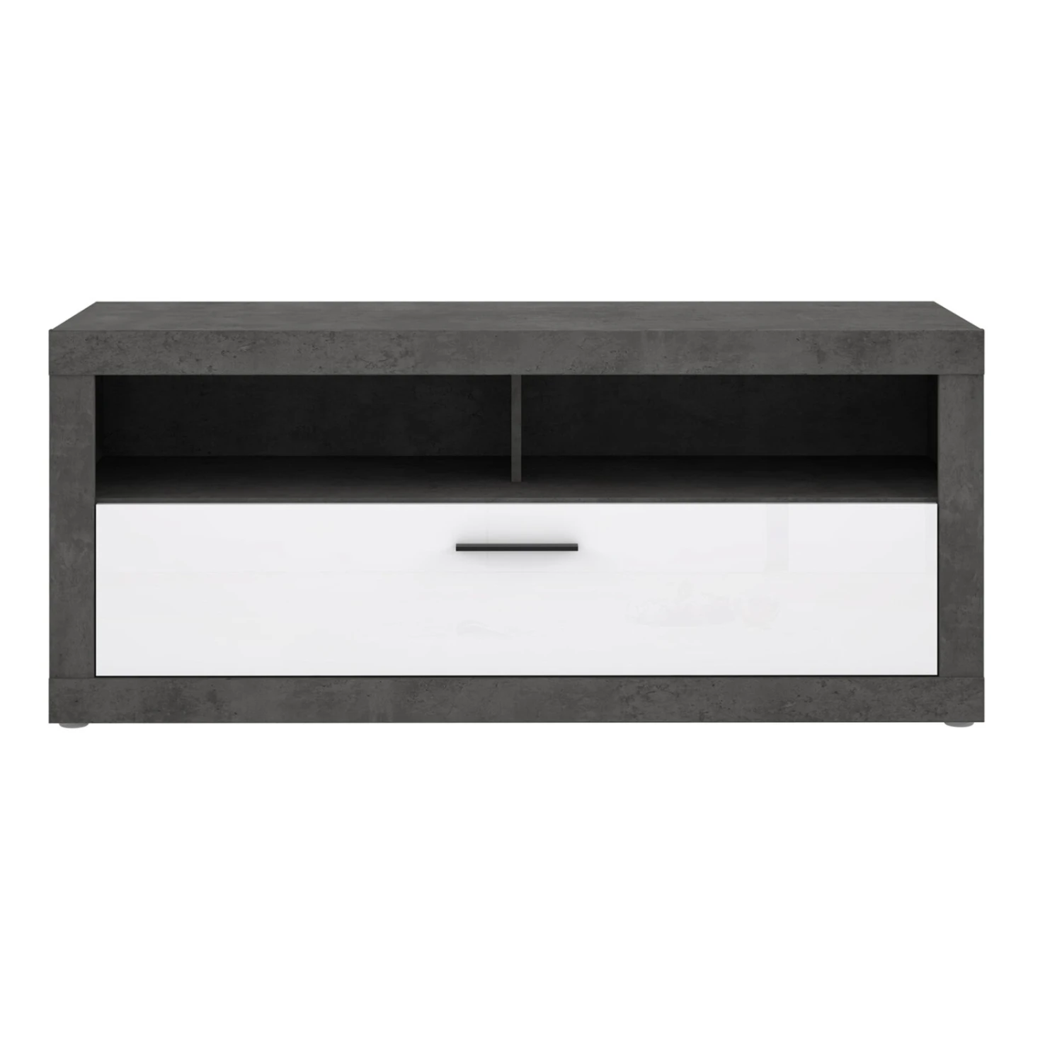 Dieses Lowboard bietet vielfältige Einsatzzwecke. Sie können dort Ihr TV-Gerät sowie andere Geräte platzieren oder es mit diversen Dekoelementen ausschmücken. Der Schubkasten mit der weißen Hochglanzfront beherbergt weiteren Stauraum.