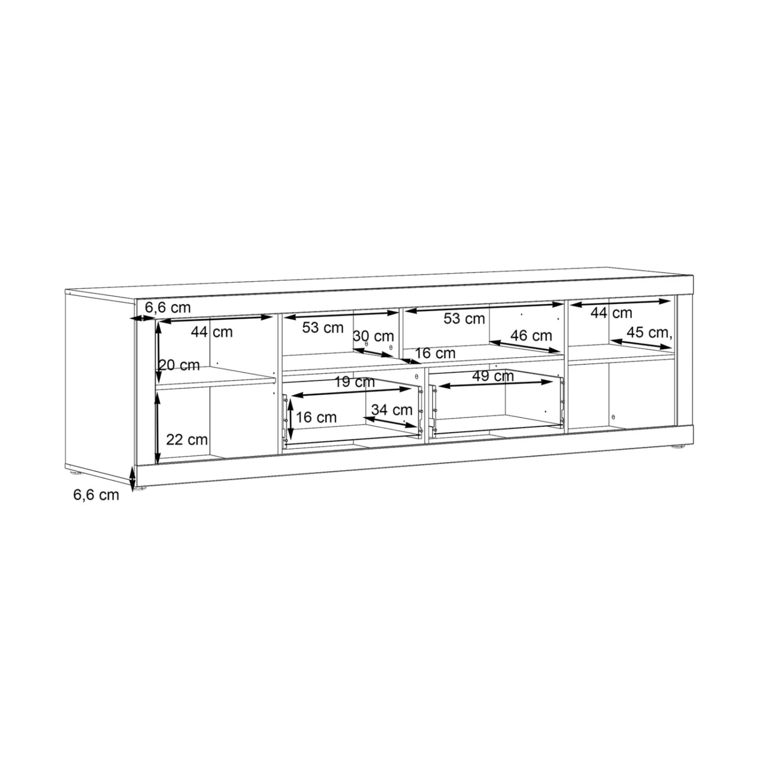 Dieses etwa 213 cm breite Lowboard eignet sich perfekt um beispielsweise Ihr TV-Gerät aufzustellen. Auch andere Dinge können hier hinter zwei Türen und einem Schubkasten gelagert werden. Die weiße Hochglanzfront verleiht diesem Lowboard eine edle Anmutung.