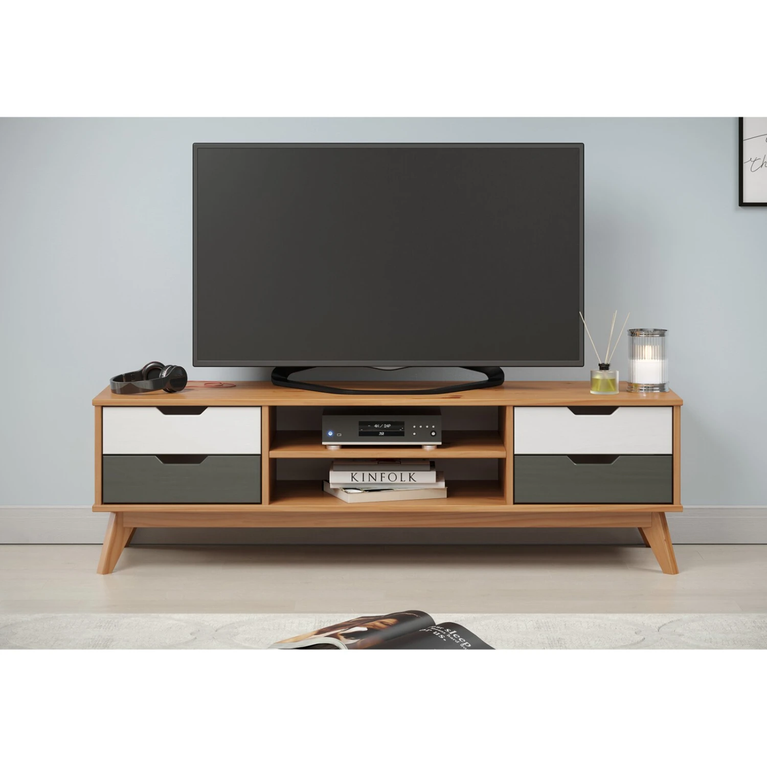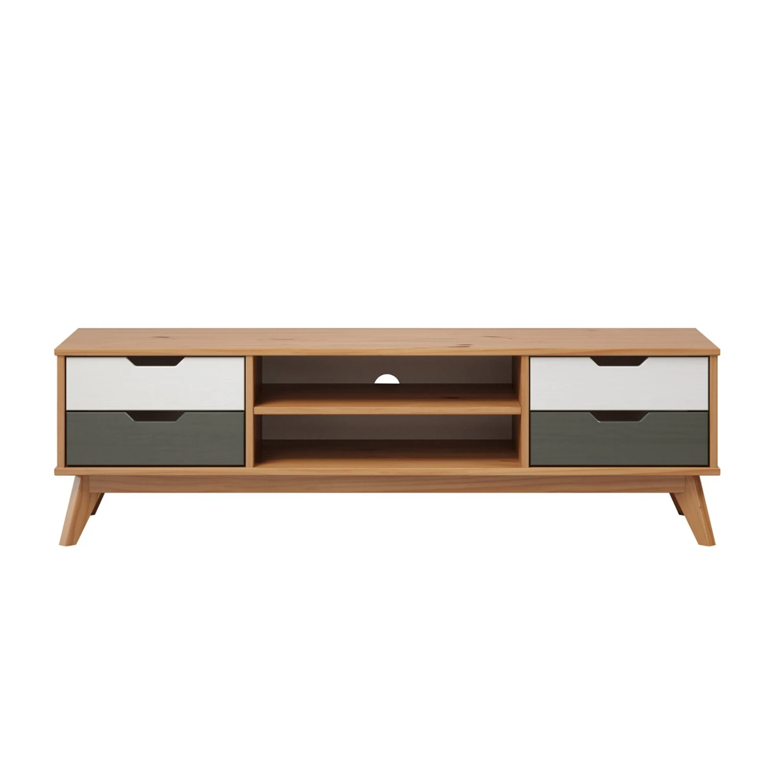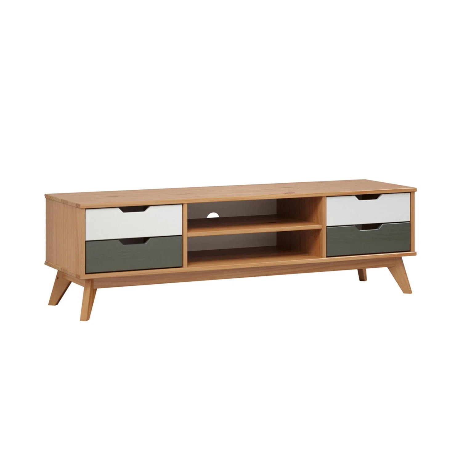 Das Lowboard eignet sich hervorragend, um einen Fernseher und das Zubehör zu platzieren. Außerdem bietet es mit seinen vier Schubkästen und zwei offenen Fächern sehr viel Stauraum.