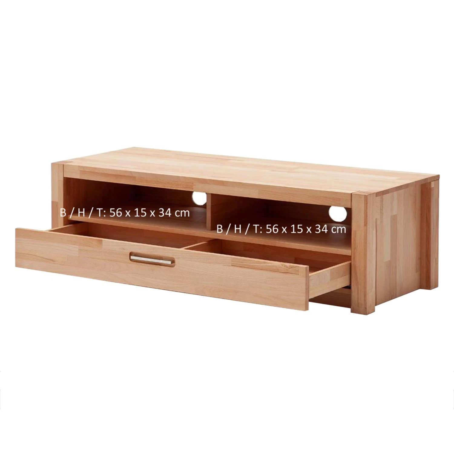 Dieses schöne Lowboard wird Sie sicherlich begeistern. Es besteht aus massiver, geölter Kernbuche und verfügt über einen Schubkasten mit eingefrästem Metallgriff sowie zwei offenen Gerätefächern. Das Lowboard eignet sich perfekt als TV-Schrank und bietet Ihnen Platz für Receiver und DVD-Player, sowie in der Schublade viel Stauraum für z.B. DVDs und allerhand Zubehör.