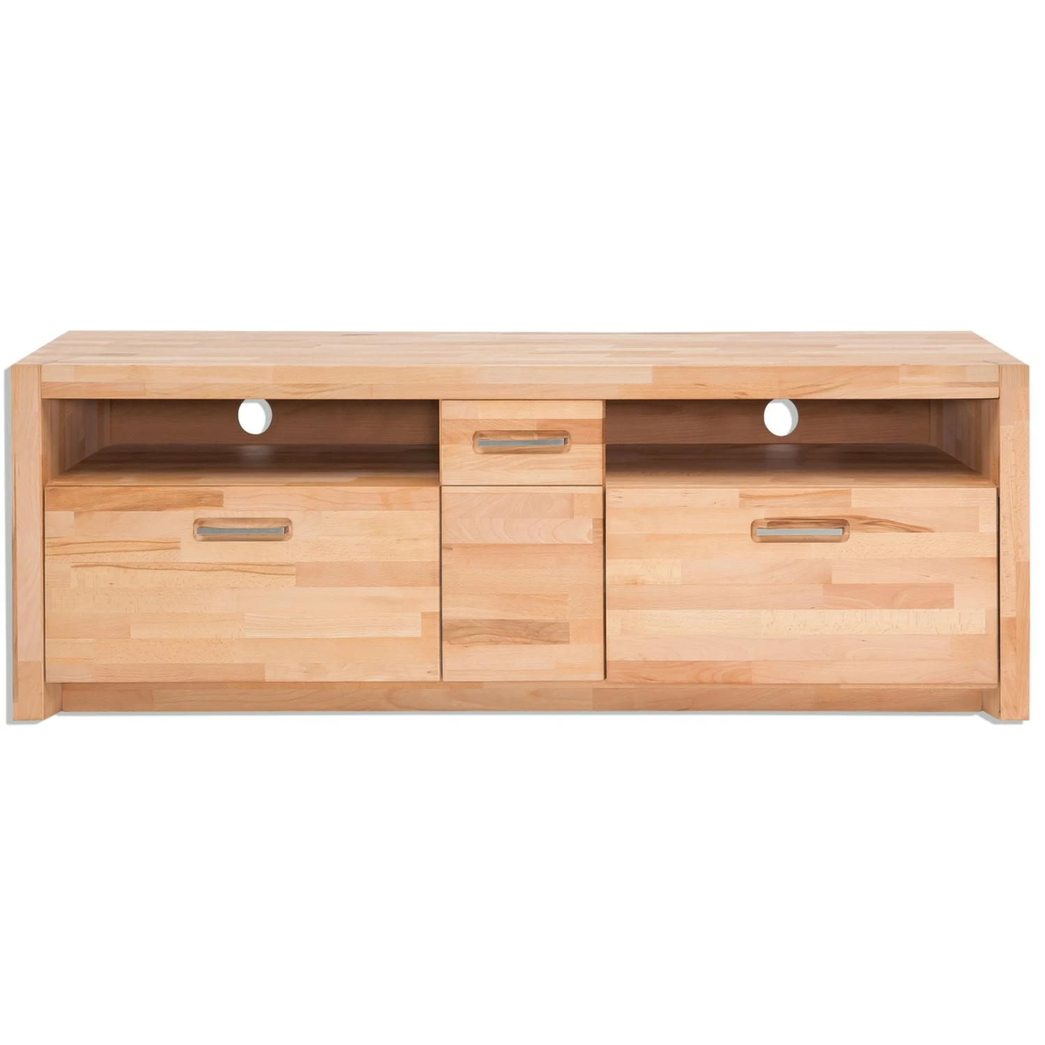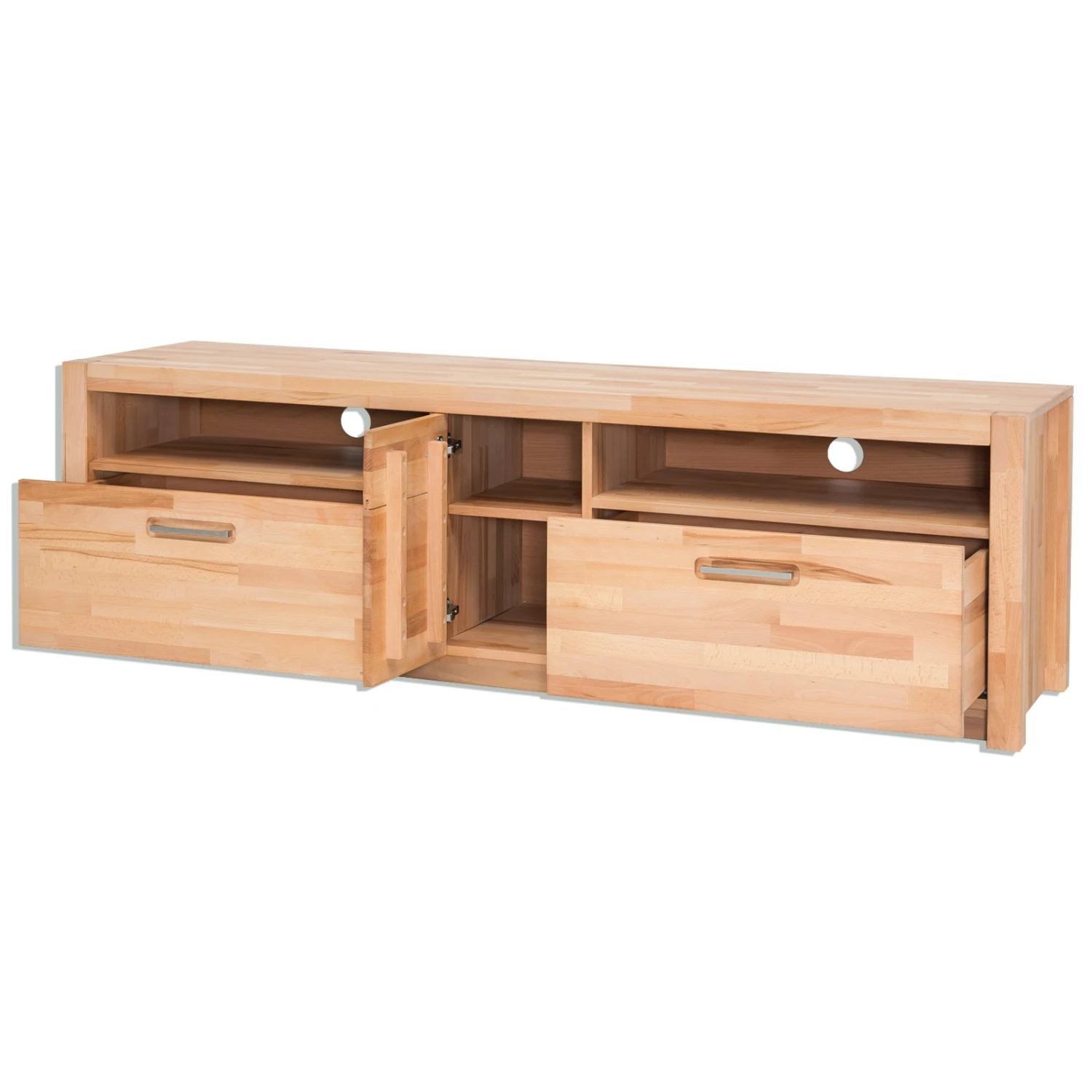 Dieses Lowboard punktet durch sein robustes Wesen in Kernbuche. Das Lowboard wurde aus Massivholz gefertigt und ist somit langlebig. Durch die geölte Oberfläche bleiben die natürlichen Maserungen des Holzes erhalten und jedes Lowboard erhält seinen ganz eigenen Charakter. In zwei Schubkästen und hinter einer Tür haben Sie die Möglichkeit, allerlei TV- und Hifi-Geräte unterzubringen. An jedem der beiden offenen Gerätefächer befindet sich ein Kabeltunnel, durch die lästige Kabelsalate einfach verschwinden.