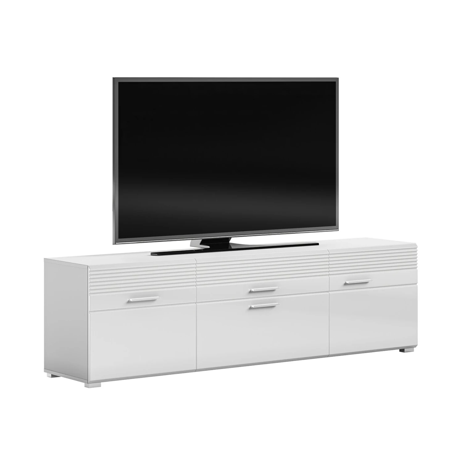 Perfektes TV-Lowboard für dein Wohnzimmer! Durch den Korpus in Weiß und den hochglänzenden Fronten ist das Lowboard schlicht und kann mit jedem Einrichtungsstil kombiniert werden. Ausgestattet ist es mit einem Schubkasten, zwei Türen und einer Klappe.