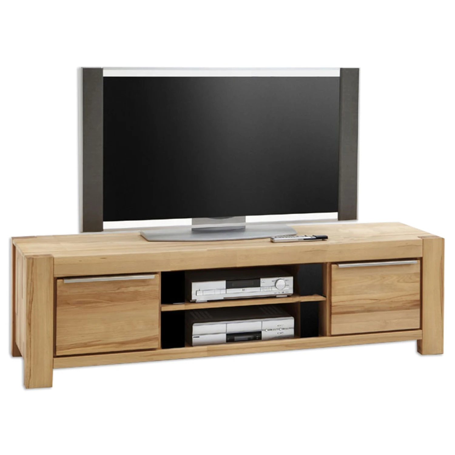 Robustes Lowboard NENA aus massiver Kernbuche mit zwei Schubfächern und zwei offenen Fächern. Dieses Lowboard eignet sich mit seinen 2 offenen Gerätefächern perfekt für Ihren Fernseher und dessen Zubehör.