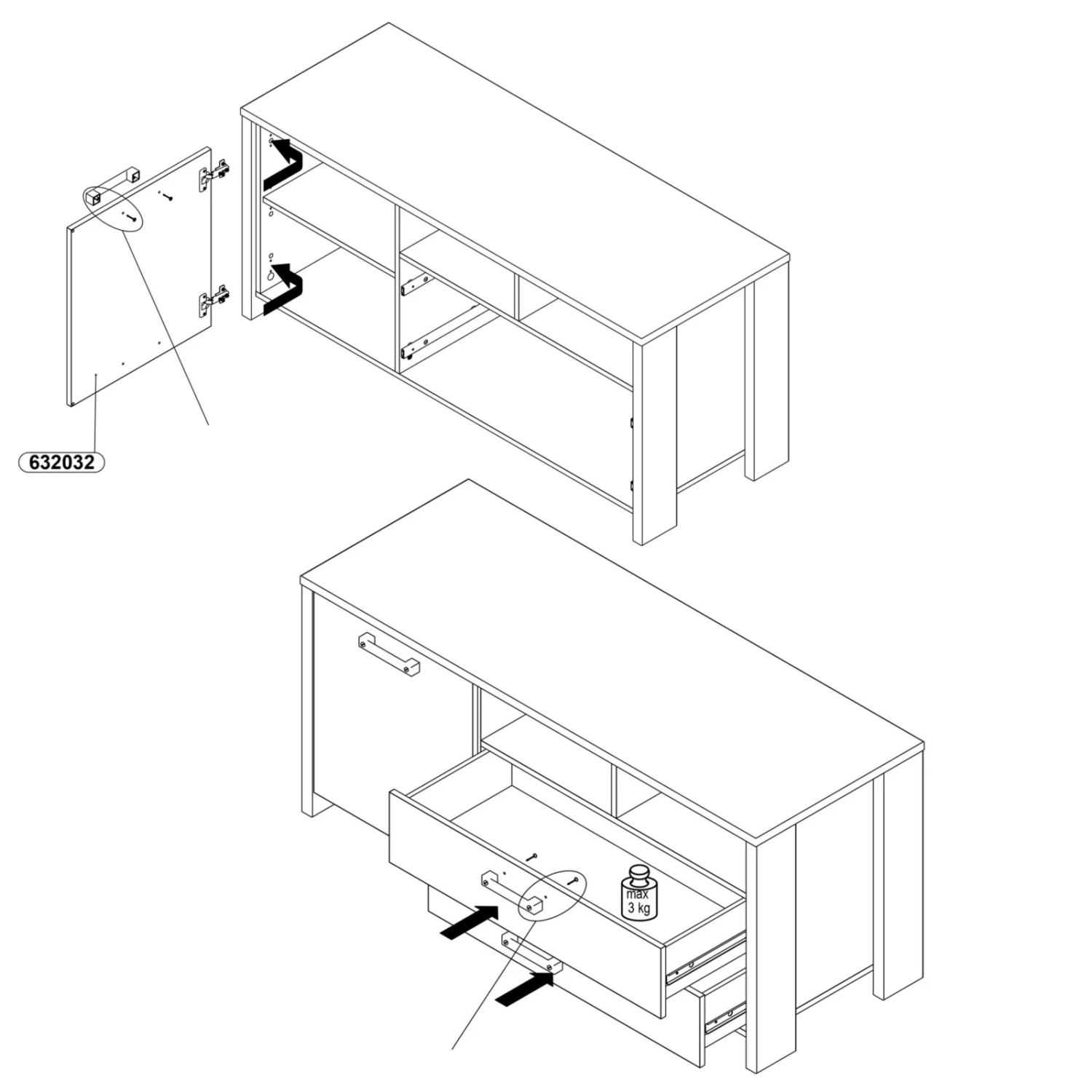 - eine Tür und 2 Schubkästen