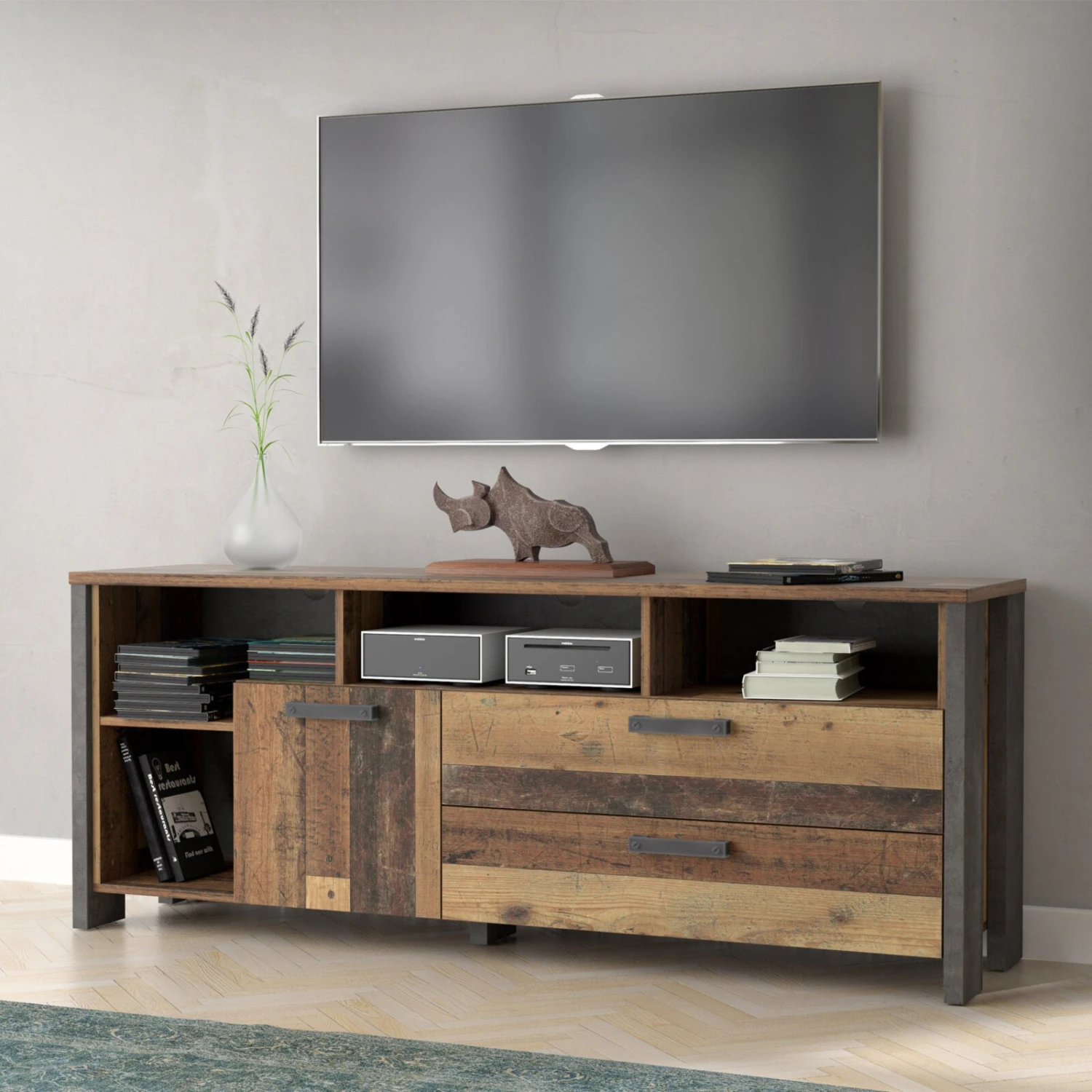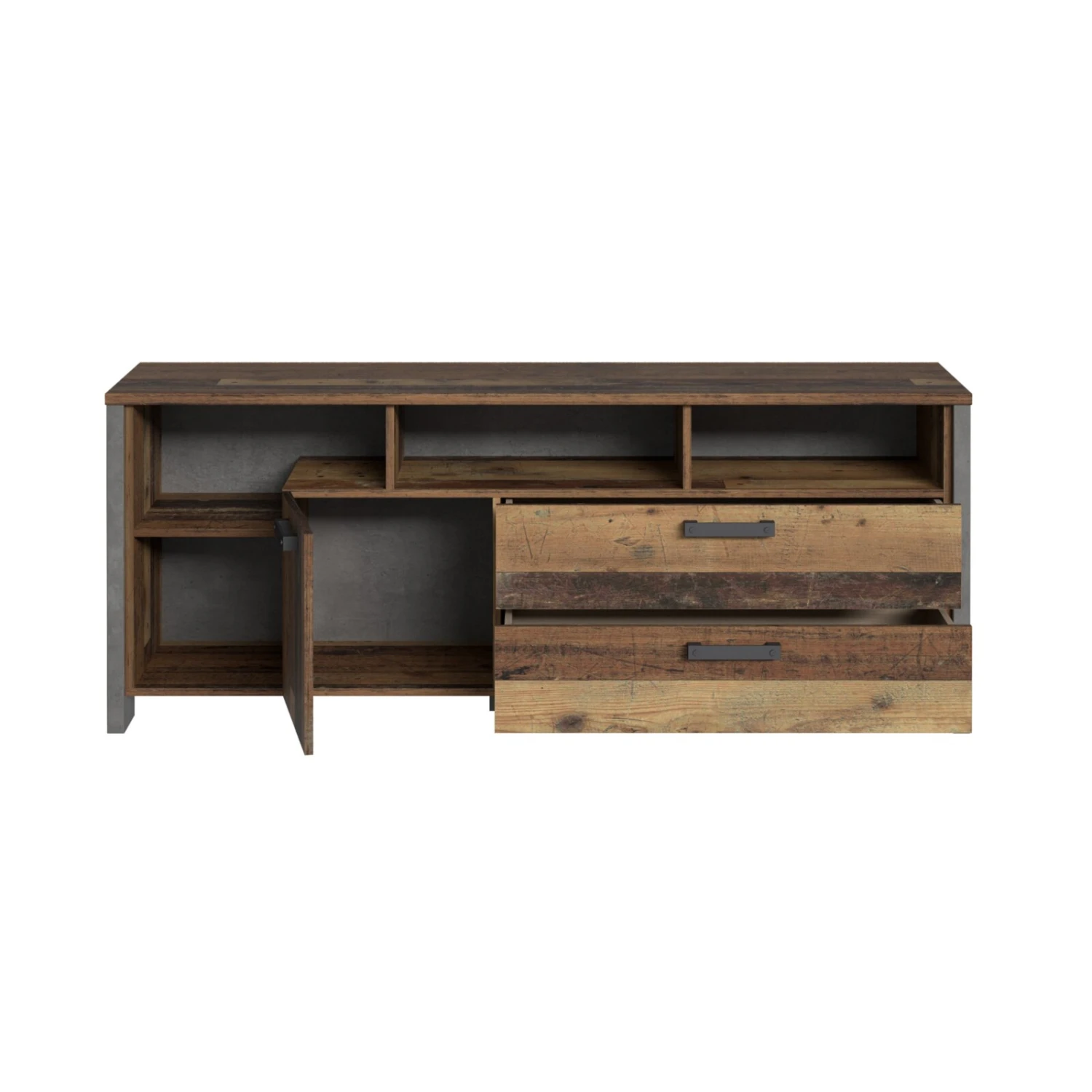Das Lowboard bringt durch die Old Wood Vintage Nachbildung und der Betonoptik einen stilvollen Hingucker in Ihr Wohnzimmer. Es kann als Schrank für Ihren Fernseher verwendet werden und bietet ausreichend Stauraum für all Ihre Utensilien. Die vier offenen Fächer sorgen dafür, dass Sie Ihre Lieblingsstücke in Szene setzen können.