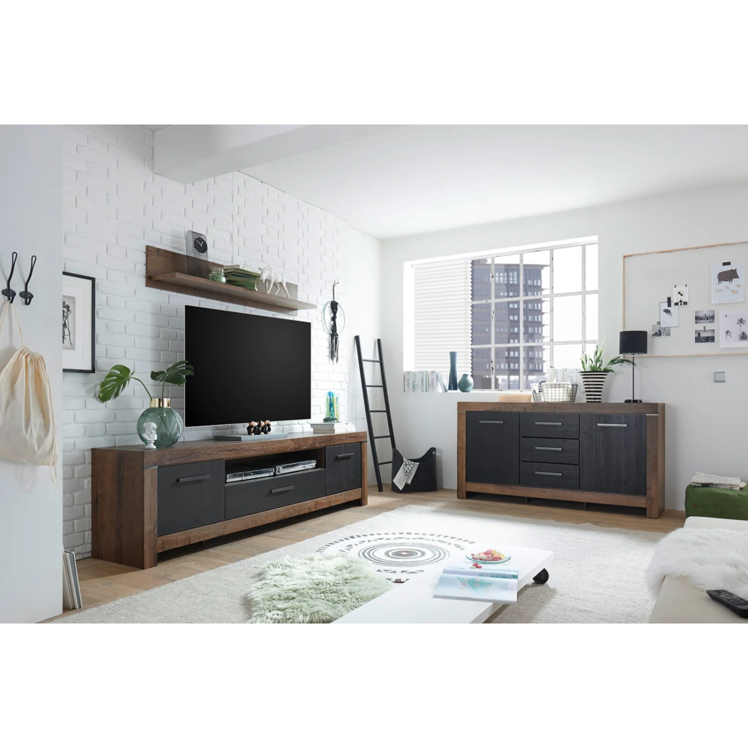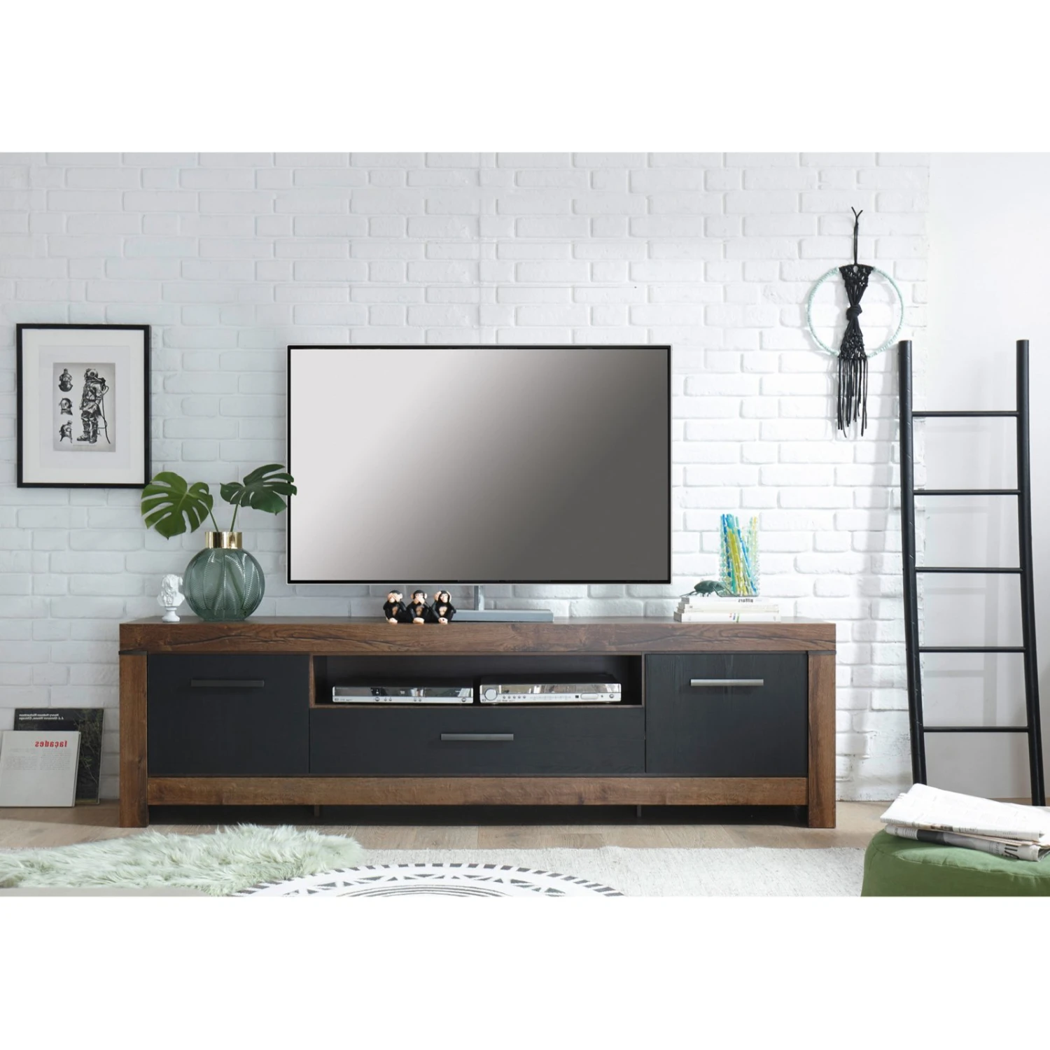 Mit dem 210 cm breiten Lowboard erhält Ihr Fernseher einen perfekten Abstellplatz und Stauraum für weitere Zusatzgeräte wie Spielkonsolen, Receiver oder Ihre Filmsammlung. Neben einem breiten Gerätefach bietet das Board einen großen Schubkasten und zwei Türen. Der Korpus ist in einer dunkelbraunen Schlammeiche Nachbildung gehalten. Die Fronten sind in Schwarzeiche abgesetzt, was für eine tolle Kombination sorgt und optisch perfekt mit weiteren Möbeln harmoniert.
