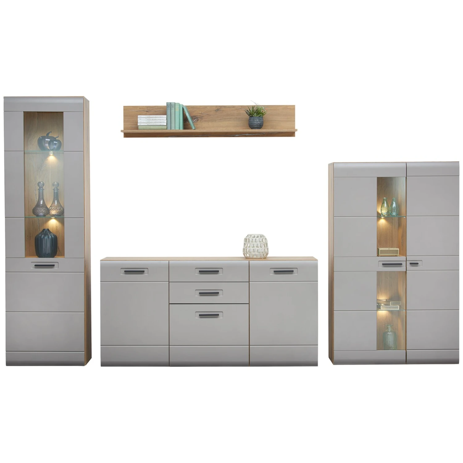 Highboardvitrine, Wandboard - Lieferumfang ohne Beleuchtung und Dekoration