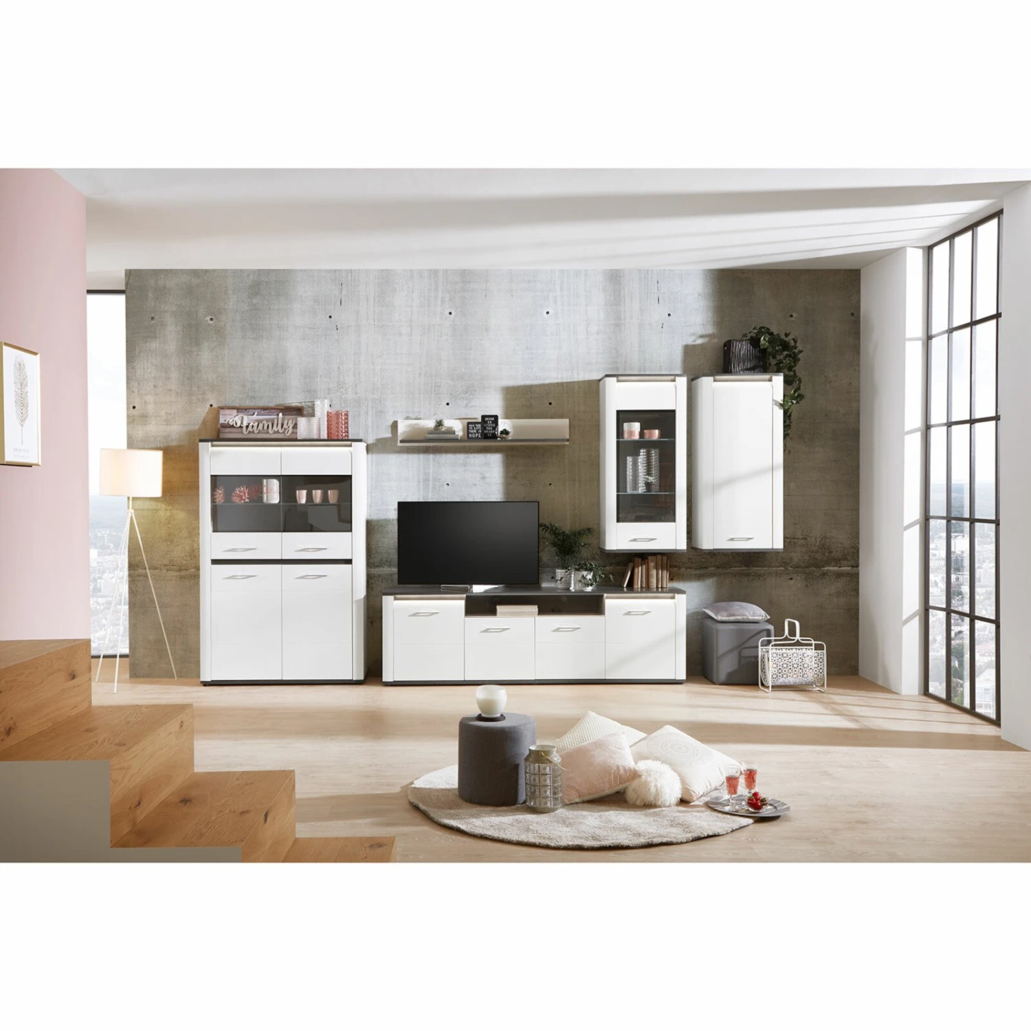 Das moderne Luca Bessoni Wohnwand-Set ALASSIO setzt sich aus fünf hochglänzenden Möbelstücken zusammen. Das moderne Design wird sich in deinem Wohnraum widerspiegeln. In den beiden Hängeschränken, in der Highboardvitrine und im TV-Lowboard findest du allerhand Stauraummöglichkeiten. Das Wandboard bietet sich optimal für deine Dekorationen an, die du in Szene setzen möchtest.