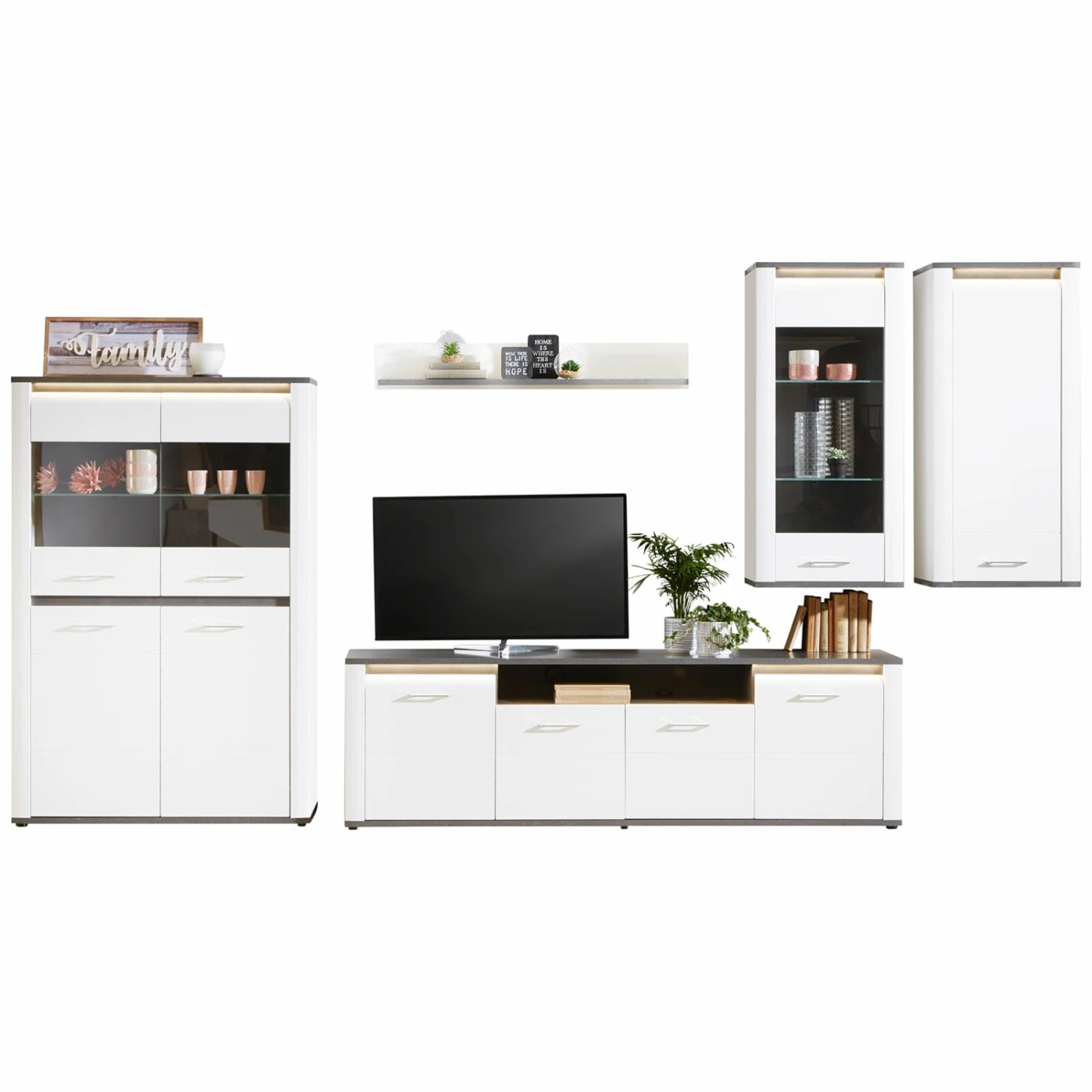 Luca Bessoni 5-teiliges Wohnwand-Set ALASSIO – weiß Hochglanz – Matera dunkel