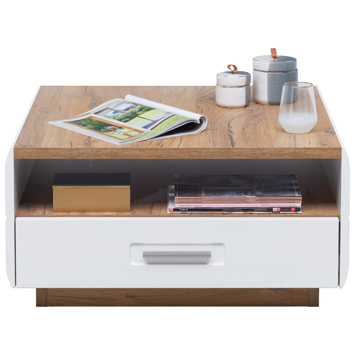 Der Luca Bessoni Couchtisch aus dem AURIS Wohnprogramm überzeugt mit einer topmodernen Optik und reichlich Stauraum für Zeitschriften und Fernbedienungen. Den tollen Look erlangt das Möbelstück durch die raffinierte Farbkombination aus Weiß und Flagstaff Eiche Nachbildung.