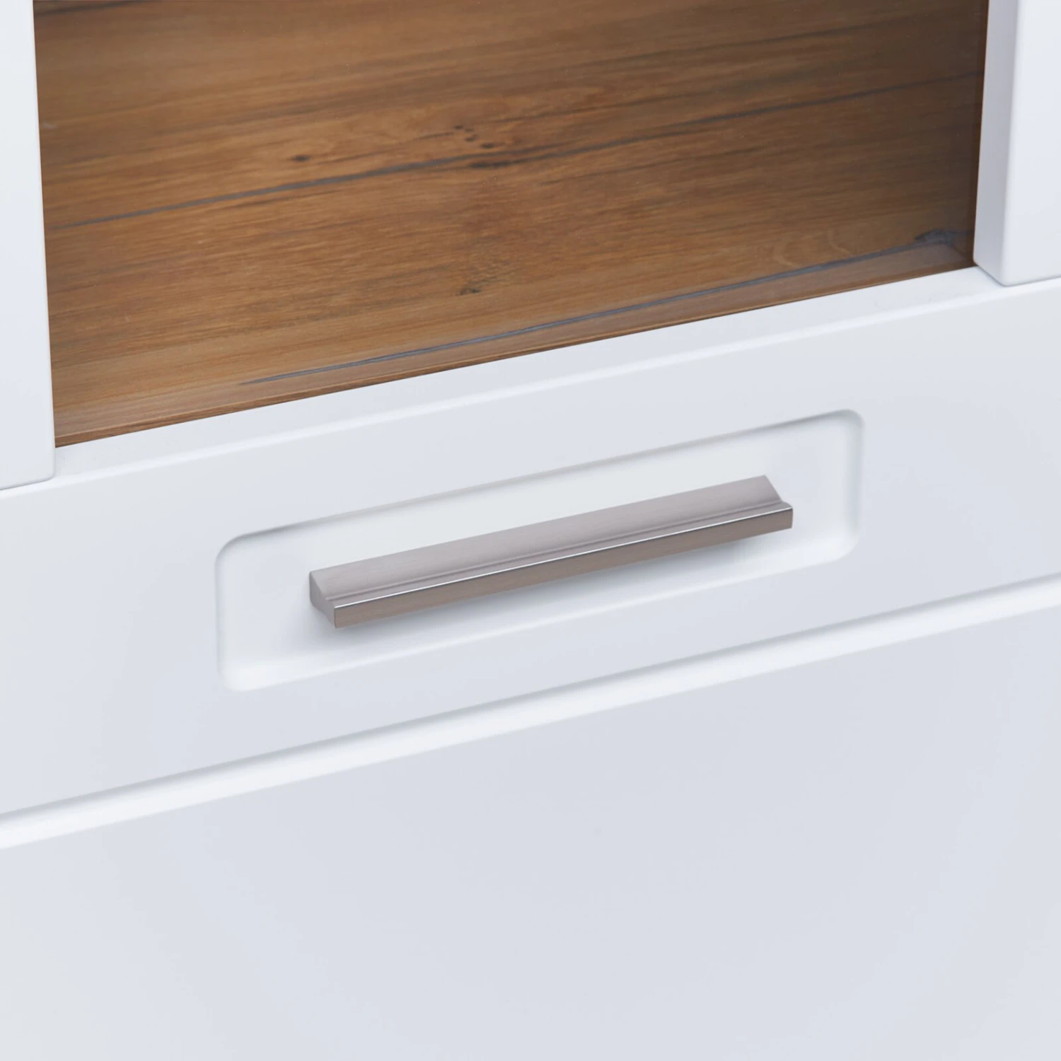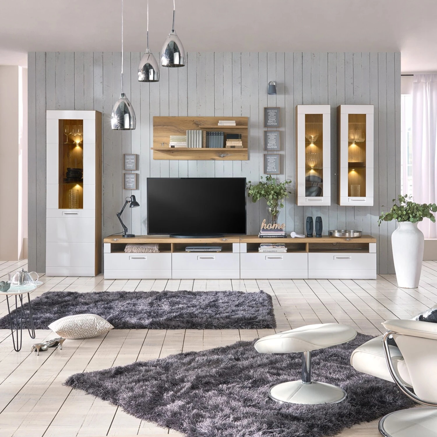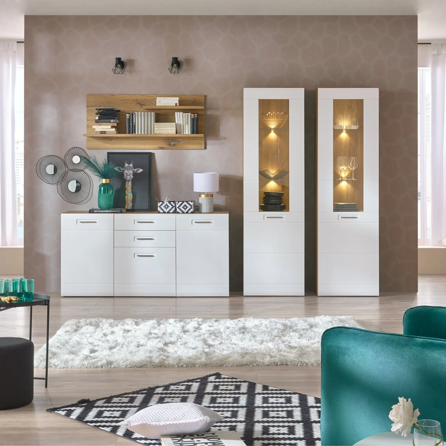 Viel Stauraum und eine topmoderne Optik bietet die Luca Bessoni Standvitrine. Das moderne Erscheinungsbild erlangt die Vitrine durch die raffinierte Farbkombination aus Weiß und Flagstaff Eiche Nachbildung. Hinter der Tür befinden sich zwei Glas- und zwei Holzeinlegeböden, die reichlich Ablagfläche für deine Dekorationen und weitere Utensilien zur Verfügung stellen.
