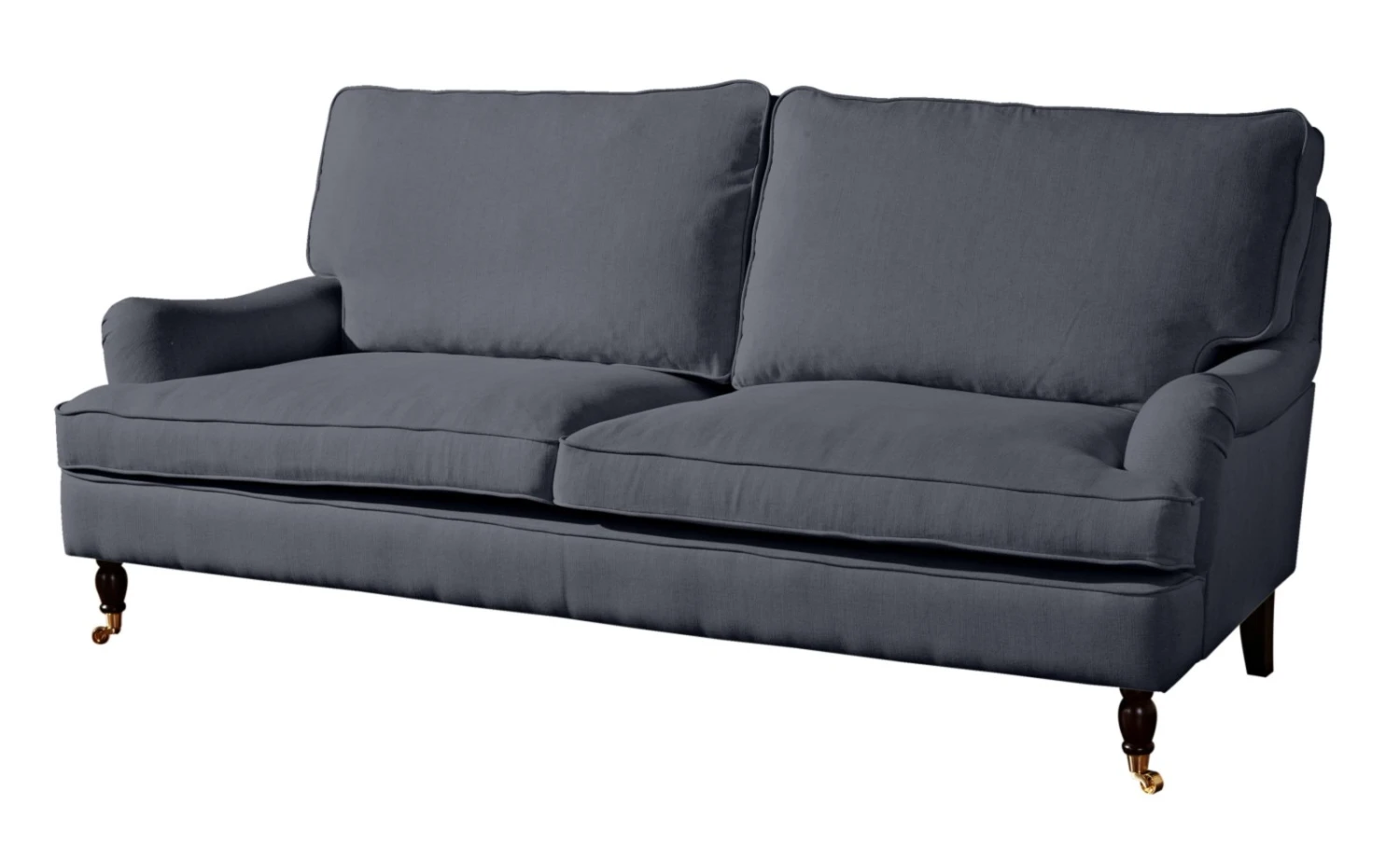 Geschwungene Linien machen dieses Sofa zu einem Hingucker. Die Armlehnen und üppigen Kissen sind harmonisch geformt und laden zum Verweilen ein. Der Bezug in anthrazitfarbener Leinenoptik unterstützt die gemütliche Atmosphäre. Besonders edles Highlight sind die kunstvoll gedrechselten Füße aus Buche, die in nussbaumfarben gehalten sind und wie Klavierfüße auf Rollen stehen. Nehmen Sie Platz auf komfortabler Wellenunterfederung, die für Stabilität und Sitzqualität steht. Die Polsterung aus luftdurchlässigem Polyätherschaum ist mit einer Diolenabdeckung versehen, die zusätzlich die Haltbarkeit des Bezugs verbessert, so dass Sie lange Freude an Ihrem neuen Wohn-Highlight haben werden.