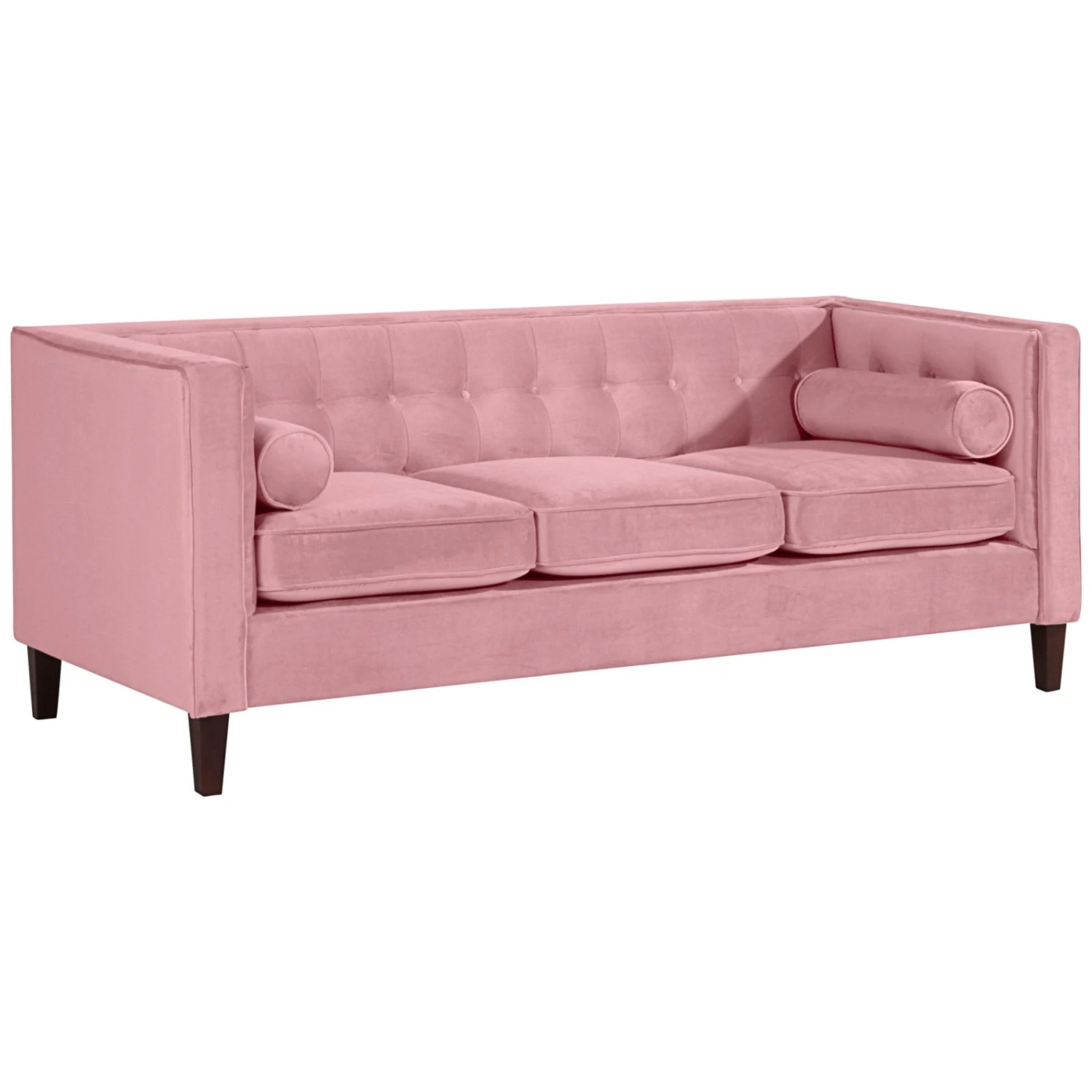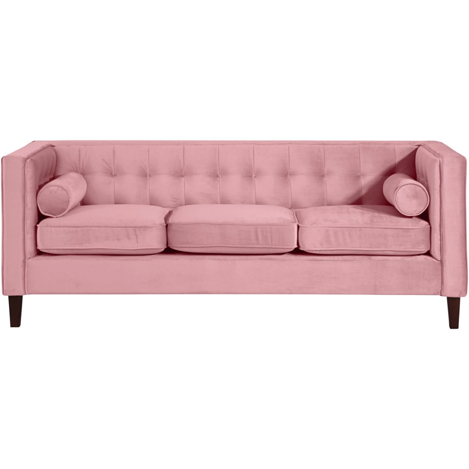 Mit einem wundervollen Design im Chesterfield Look präsentiert sich dieses 3er Sofa. Lassen Sie sich von geraden Linien und einer dezenten Steppung im Rückenbereich überzeugen. Typisch für diesen Stil ist der Holzrahmen aus Buchenholz und die losen Sitzkissen, die hier noch mit zwei runden Zierkissen ergänzt werden. Der Bezug aus Samtvelours in Rosé findet sich auf den Kissen und auch am Rücken, so dass Sie das Sofa nach Wunsch auch mitten in den Raum stellen können. Die konischen Füße sind aus massiver Buche und in einem dunkeln Nussbaum Ton gehalten. Für einen komfortablen Sitz sorgt die Wellenunterfederung, die mit Polyätherschaum gepolstert wurde, der besonders für seine Luftdurchlässigkeit bekannt ist.