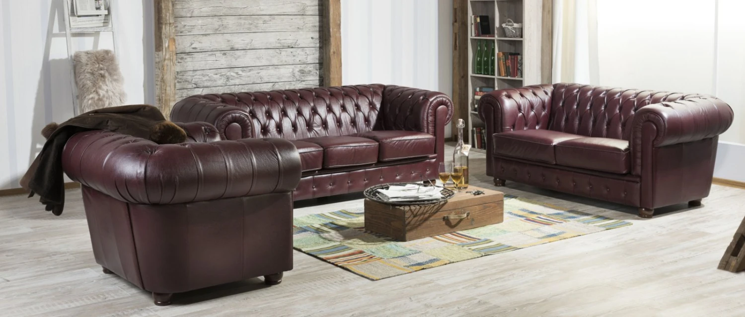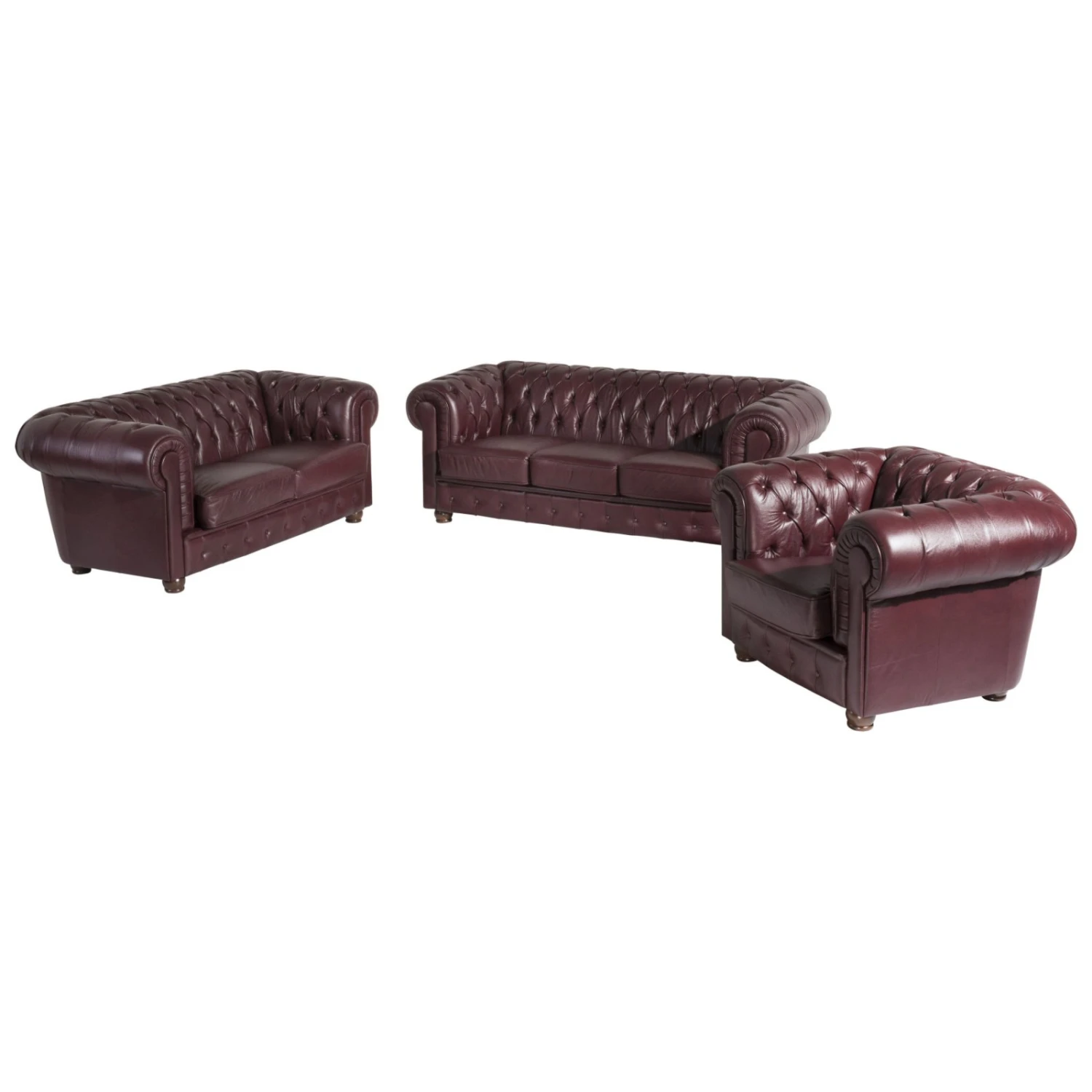 Diese Garnitur holt den englischen Chesterfield Stil in Ihr Wohnzimmer. Mit handwerklicher Wertarbeit wurden die aufwändigen Knopfheftungen im Rücken, an der Sitzrampe und den geschwungenen Armlehnen gefertigt. Diese Garnitur in Rot überzeugt durch ihre Optik. Gearbeitet mit viel Liebe zum Detail erhält diese Garnitur ihren markanten, unverwechselbaren Look. Auch die Rückseite ist original bezogen und ebenso verarbeitet, damit ist die Garnitur frei im Raum stellbar.