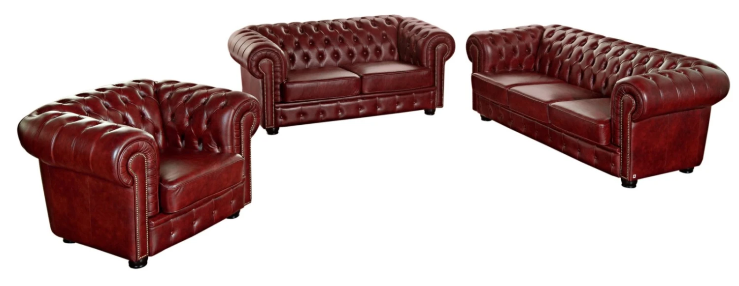 Dekorativ und komfortabel präsentiert sich diese 3-teilige Garnitur, die aus einem 3-Sitzer, einem 2-Sitzer und dem passenden Sessel besteht. Der rote Lederbezug wurde am Rücken, den Armlehnen und der Sitzleiste mit aufwendiger Knopfheftung im Chesterfieldstil versehen. An der Vorderseite der Armlehnen wurde ein dekoratives Ziernagelband eingearbeitet und zusammen mit den gedrechselten Füßen aus Buche Massivholz ergibt sich ein optisch abgerundetes Wohnhighlight. Der Sitz ist mit einer Gurtunterfederung versehen und die chesterfield typisch losen Sitzkissen sind mit Polyätherschaum gepolstert und mit einer Diolenabdeckung versehen, die den Bezug zusätzlich schützt. Lassen Sie diese luxuriöse Garnitur bei Ihnen einziehen.