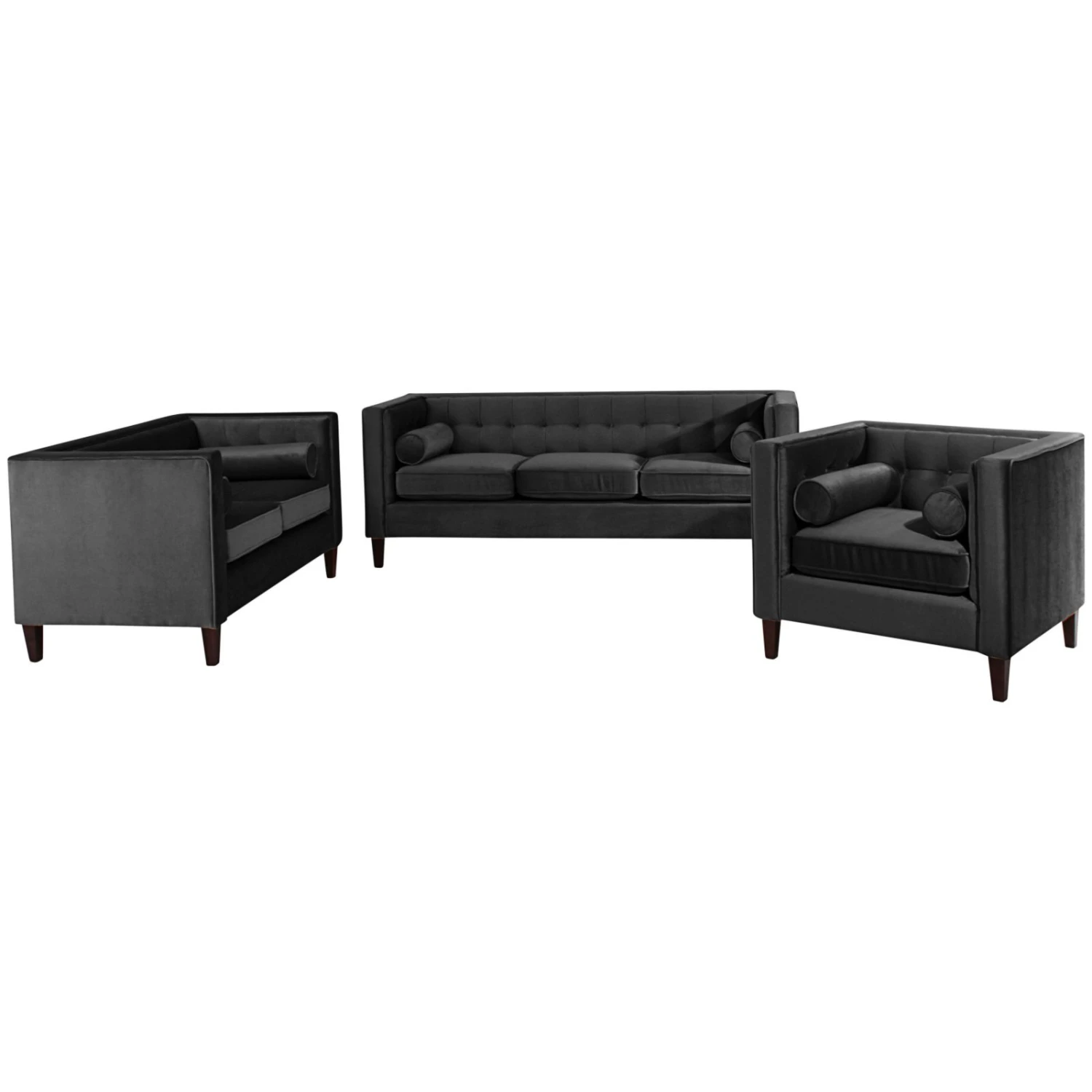 Mit dieser Polstergarnitur zieht der unverwechselbar Chesterfieldstil bei Ihnen ein. Das klassisch, englische Design mit geraden Linien, Steppungen und losen Kissen wird zum echten Blickfang bei Ihnen werden. Die Garnitur besteht aus einem 3-Sitzer, einem 2-Sitzer und einem Cocktailsessel und bietet reichlich Platz für Ihre Gäste. Der Bezug aus Samtvelours in Schwarz findet sich auf den Kissen und auch am Rücken, so dass Sie die Garnitur nach Wunsch auch mitten in den Raum stellen können. Die konischen Füße sind aus massiver Buche und in einem dunkeln Nussbaum Ton gehalten. Für einen komfortablen Sitz sorgt die Wellenunterfederung, die mit Polyätherschaum gepolstert wurde, der besonders für seine Luftdurchlässigkeit bekannt ist.