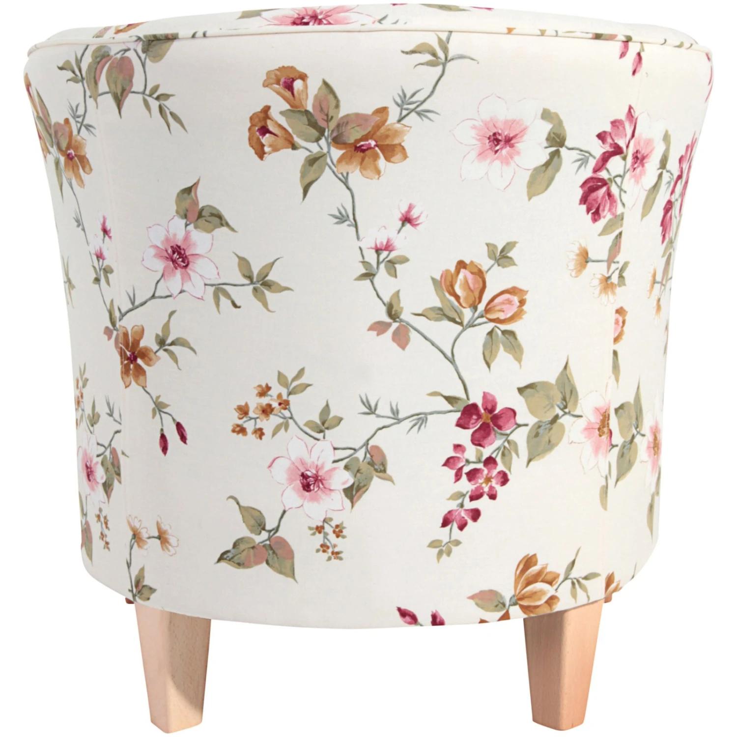 Kleiner, zierlicher Cocktailsessel in Weiß, der universell kombinierbar ist und in jeden Raum passt. Das florale Muster auf hellem Untergrund verleiht Ihrem Wohnraum einen frischen Akzent. Die Füße sind zur einfachen Selbstmontage, bestehen aus Buche und sind trapezförmig. Der Cocktailsessel hat eine ideale Sitzhöhe von 45cm.