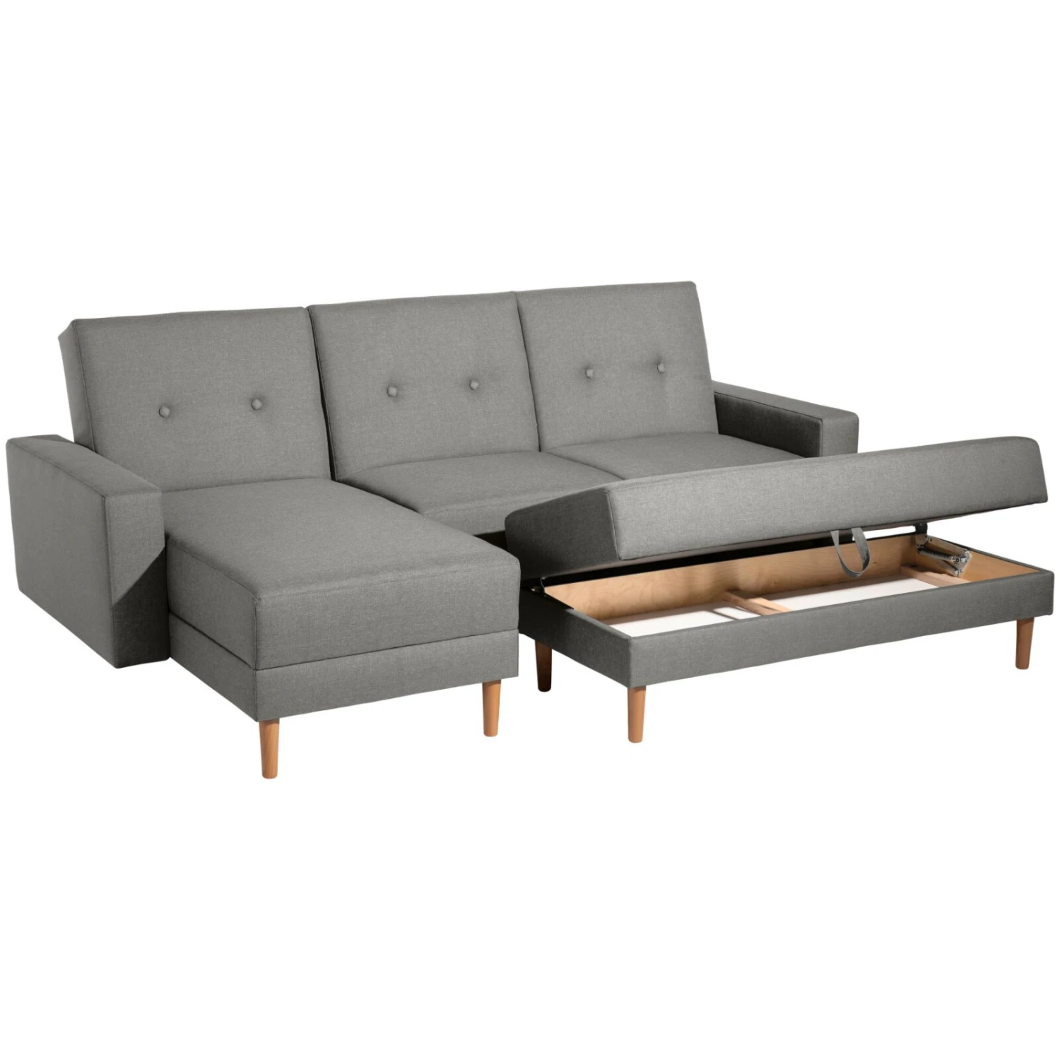Dieses Ecksofa erhalten Sie im Set mit einem passenden Stauraumhocker. Mit diesem können Sie aus dem Ecksofa im Handumdrehen eine Liegefläche zaubern aber auch Ihre Füße hochlegen oder ein Tablett abstellen. Toll ist auch der Staukasten, der sich im Inneren des Hockers befindet. Die zeitlos klassische Longchair-Garnitur mit aufwendiger Knopfheftung im Rücken punktet mit Stil, Funktion und Komfort. Edle Füße aus massiver Erle runden das Gesamtbild harmonisch ab. Der Longchair ist wahlweise rechts oder links montierbar. Für das bestmögliche Sitzerlebnis lässt sich der Rücken 5-fach verstellen.