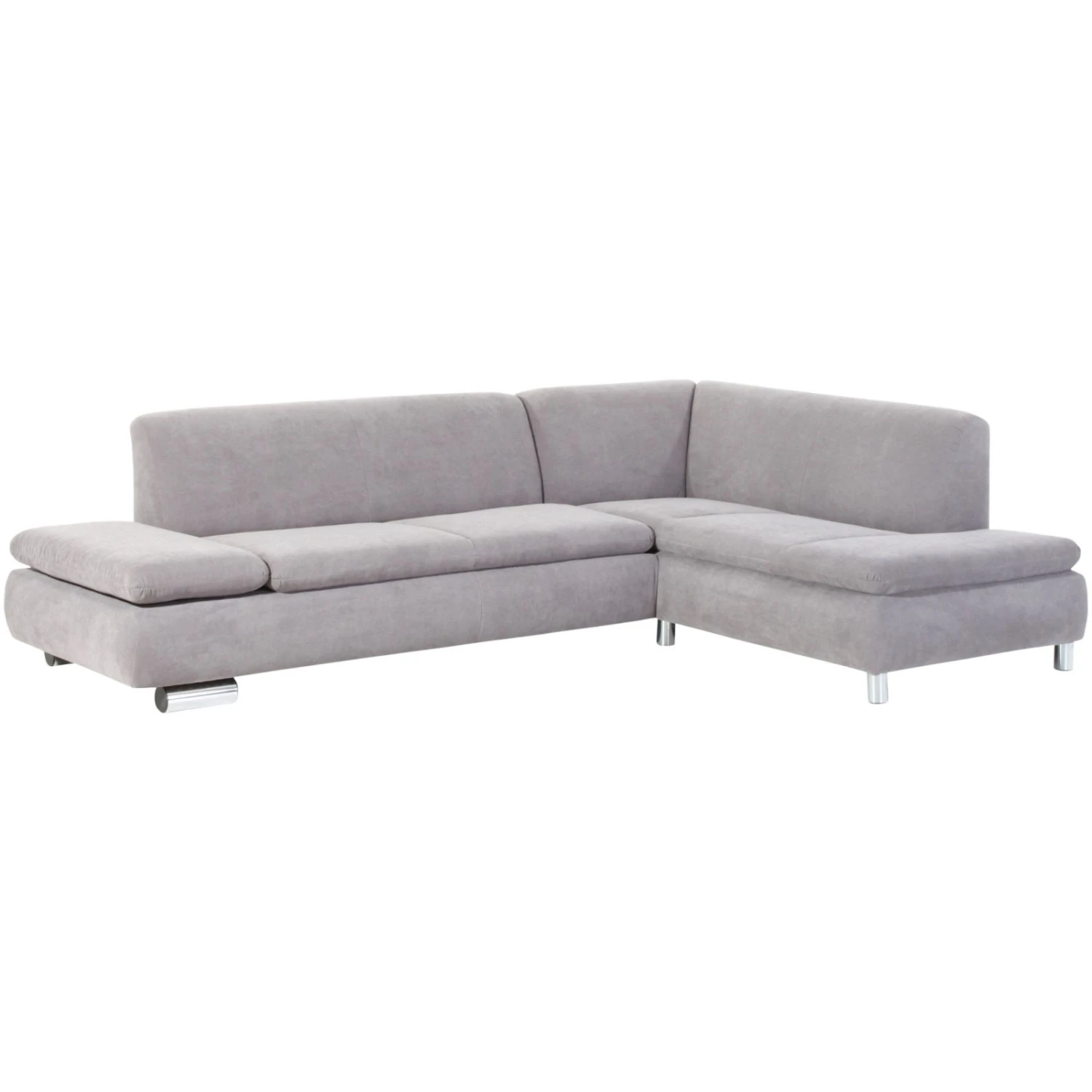 Genießen Sie viele gemütliche Stunden auf diesem Ecksofa. Der Veloursstoffbezug in Silber ist weich und hat eine flauschige Haptik. Die Armlehne ist in drei Stufen verstellbar, so dass Sie diese Ihren Wünschen anpassen können, je nachdem, ob Sie sitzen, liegen oder die Beine hochlegen möchten. Die Wellenunterfederung ist mit Polyätherschaum gepolstert, so dass auch für eine komfortable Sitzposition und -stabilität gesorgt ist. Die Diolenabdeckung befindet sich zwischen Polsterung und Bezug, um die Haltbarkeit dieses zu verlängern, damit Sie sehr lange Freude daran haben. Sie können das Ecksofa nach Ihren Vorstellungen stellen, da auch der Rücken bezogen ist und Sie so nicht auf eine Wand angewiesen sind. Die chromfarbenen, runden Füße schimmern toll unter dem Sofa hervor und runden die moderne Erscheinung gekonnt ab.