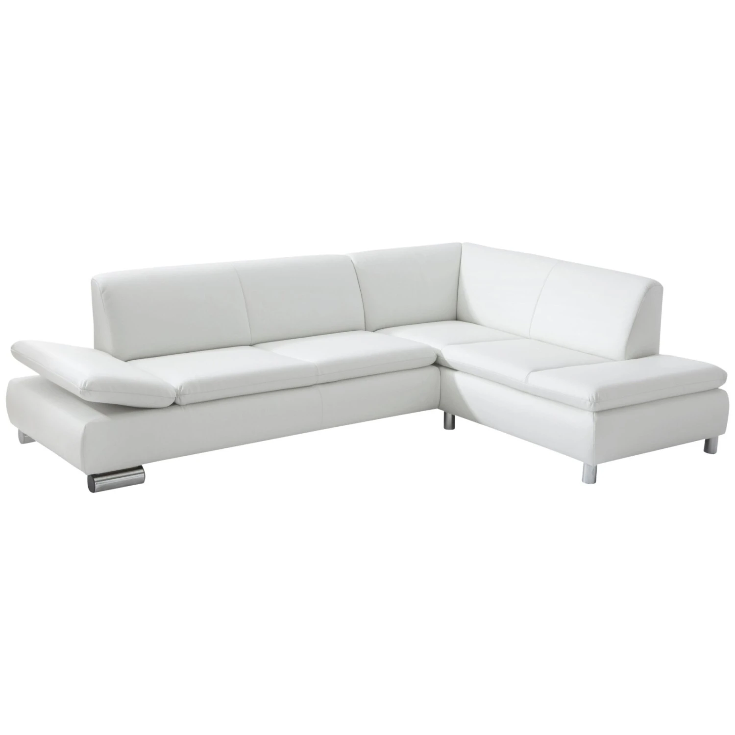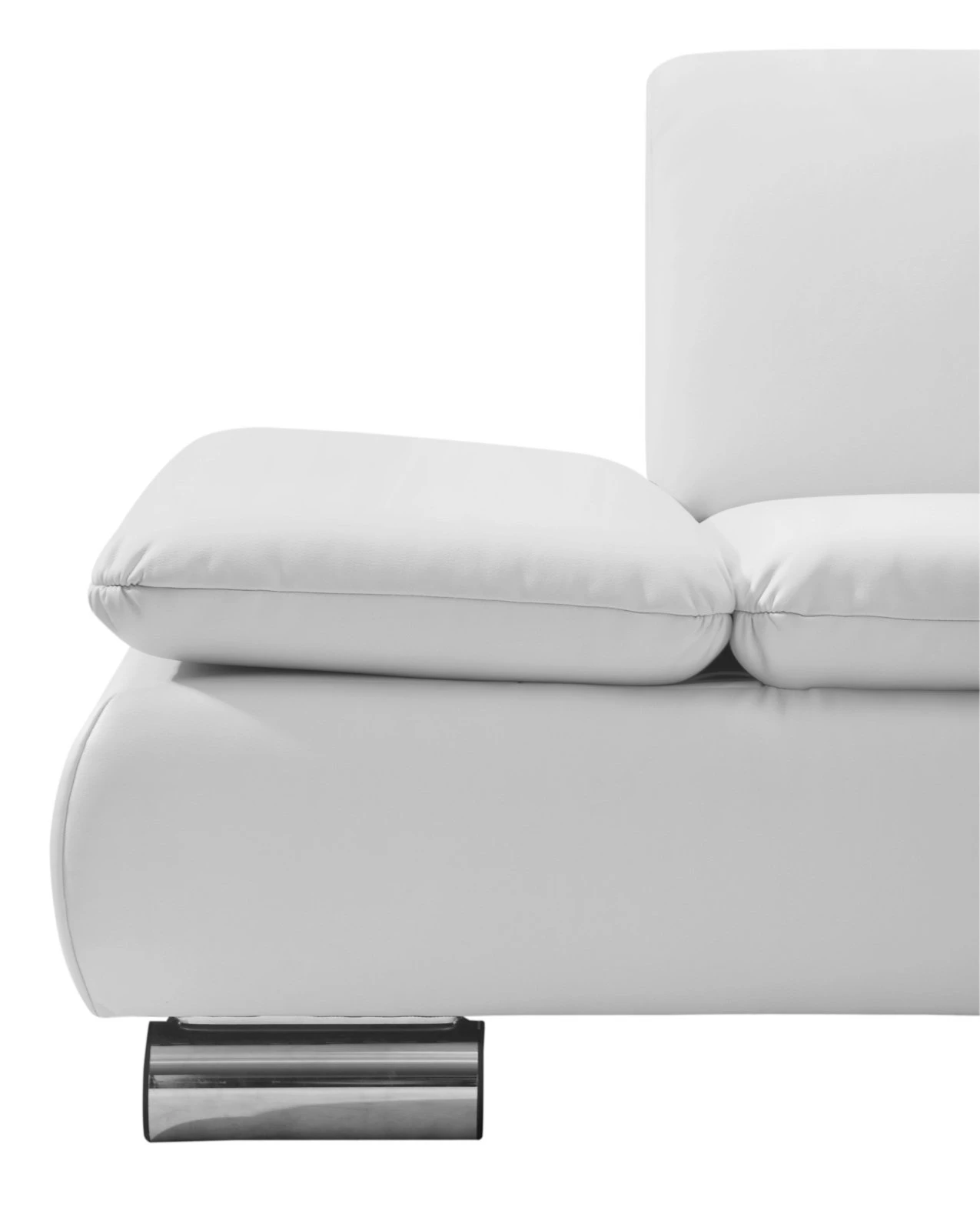 Im Sitzen Lesen oder den Kopf betten für ein Nickerchen – mit diesem Ecksofa sind Sie für jede Situation ausgestattet. Die Armlehne ist in drei Stufen klappbar, so dass Sie zwischen einer Höhe von 0 bis 25 cm bestimmen können, welches heute die ideale Position für Sie ist. Zudem bietet die aufgesetzte Schaumpolsterung in Kombination mit der Wellenunterfederung hohen Sitzkomfort. Äußerlich überzeugt der Kunstlederbezug in Weiß, der sich auch an der Rückseite befindet. Die chromfarbenen Füße runden die Erscheinung ab und bringen ein modernes Wohnhighlight zu Ihnen.