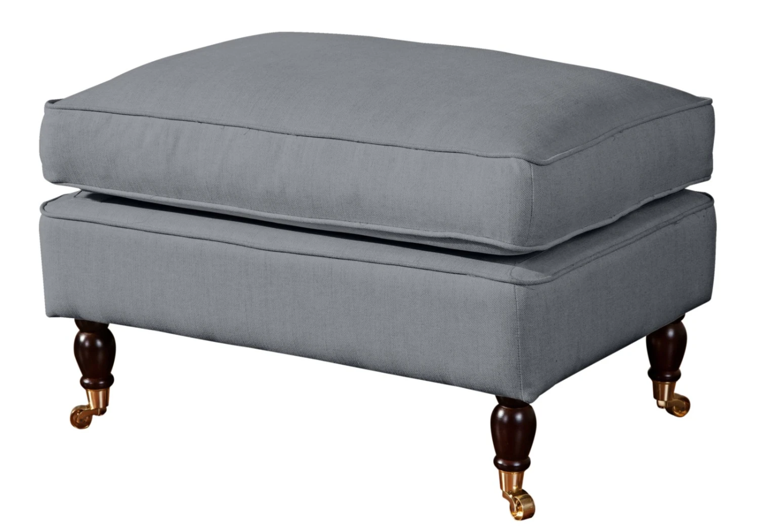 Auf vier Füßen mit dekorativen Klavierrollen steht dieser Hocker. Die Rollen sind an gedrechselten Holzfüße aus Buche Massivholz befestigt, die in dunklem Nussbaum gehalten sind. Der Bezug in Grau ist ein Flachgewebe in Leinenoptik, das sich angenehm anfühlt. Die Sitzhöhe ist ca. 48 cm, so dass er als zusätzlicher Sitzplatz angeboten werden kann. Natürlich eignet er sich auch als Tisch für ein Tablett oder zum Beine hochlegen.
