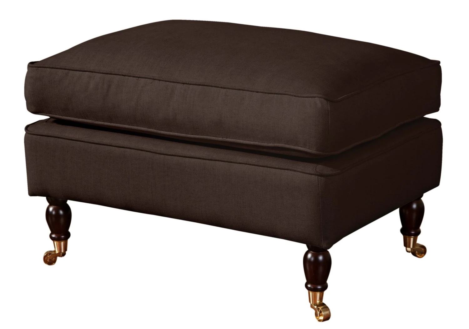 Auf vier Füßen mit dekorativen Klavierrollen steht dieser Hocker. Die Rollen sind an gedrechselten Holzfüße aus Buche Massivholz befestigt, die in dunklem Nussbaum gehalten sind. Der Bezug in Schoko ist ein Flachgewebe in Leinenoptik, das sich angenehm anfühlt. Die Sitzhöhe ist ca. 48 cm, so dass er als zusätzlicher Sitzplatz angeboten werden kann. Natürlich eignet er sich auch als Tisch für ein Tablett oder zum Beine hochlegen.