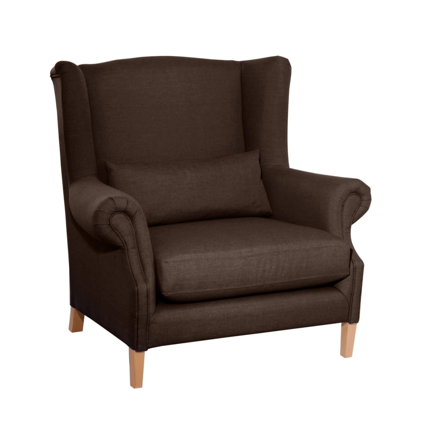 Dieser extrabreite Ohrenbackensessel in Schoko überzeugt durch sein trendiges Design. Er verfügt über ein Nierenkissen (ca. 70 x 30 cm) im Rücken. Dadurch kann die Sitztiefe beliebig variiert werden. Die Füße sind zur einfachen Selbstmontage. Der Sessel hat eine optimale Sitzhöhe von 52 cm.
