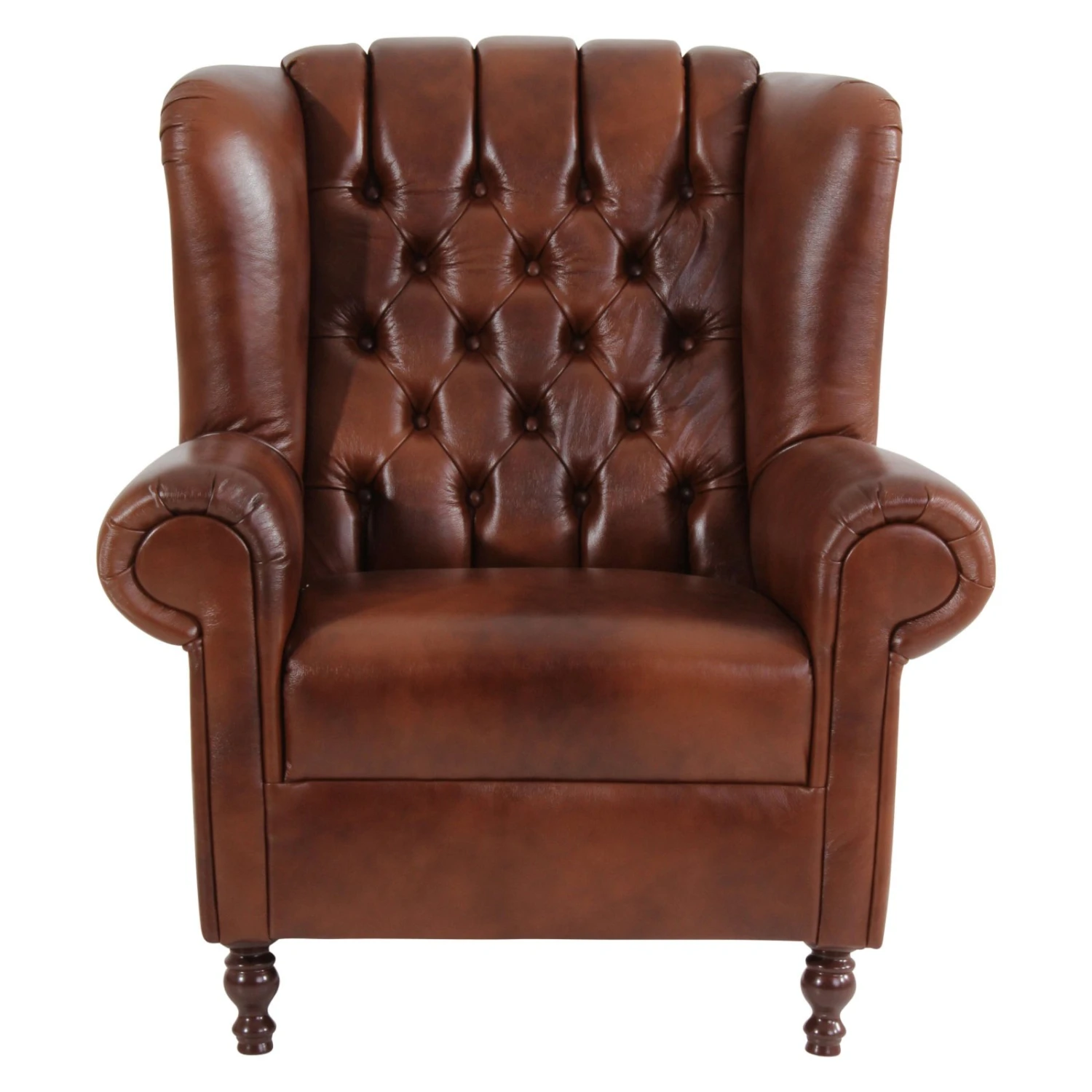 Mit einem edlen Echtlederbezug in Braun präsentiert sich dieser fabelhafte Ohrensessel, der zum Lesen, Fernsehen und Entspannen einlädt. Der Chesterfield-Look verleiht diesem Möbelstück das besondere Etwas, was ihn zum echten Blickfang macht. Für besondere Eleganz sorgen die schicke, aufwändige Knopfheftung und die geschwungenen Armlehnen. Sehr edel wirken die massiven und gedrechselten Füße in Nussbaumfarben. Diese runden die tolle und charmante Optik dieses Sessels noch stimmig ab.