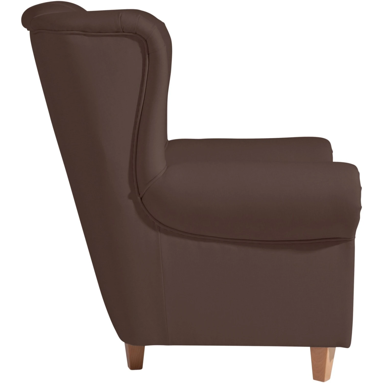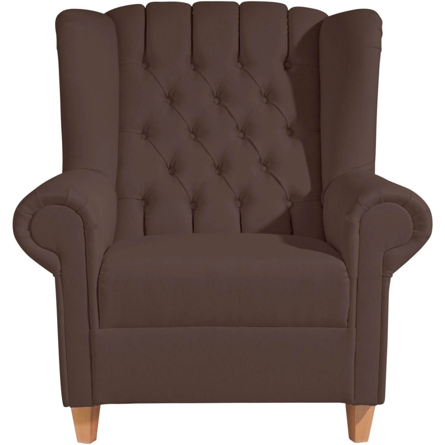 Mit einem pflegeleichten Kunstleder-Bezug in Braun präsentiert sich dieser fabelhafte Ohrensessel, der zum Lesen, Fernsehen und Entspannen einlädt. Der Chesterfield-Look verleiht diesem Möbelstück das besondere Etwas, was ihn zum echten Blickfang macht. Für besondere Eleganz sorgen die schicke, aufwändige Knopfheftung und die geschwungenen Armlehnen. Sehr edel wirken die massiven und gedrechselten Füße in Buchefarben. Diese runden die tolle und charmante Optik dieses Sessels noch stimmig ab.