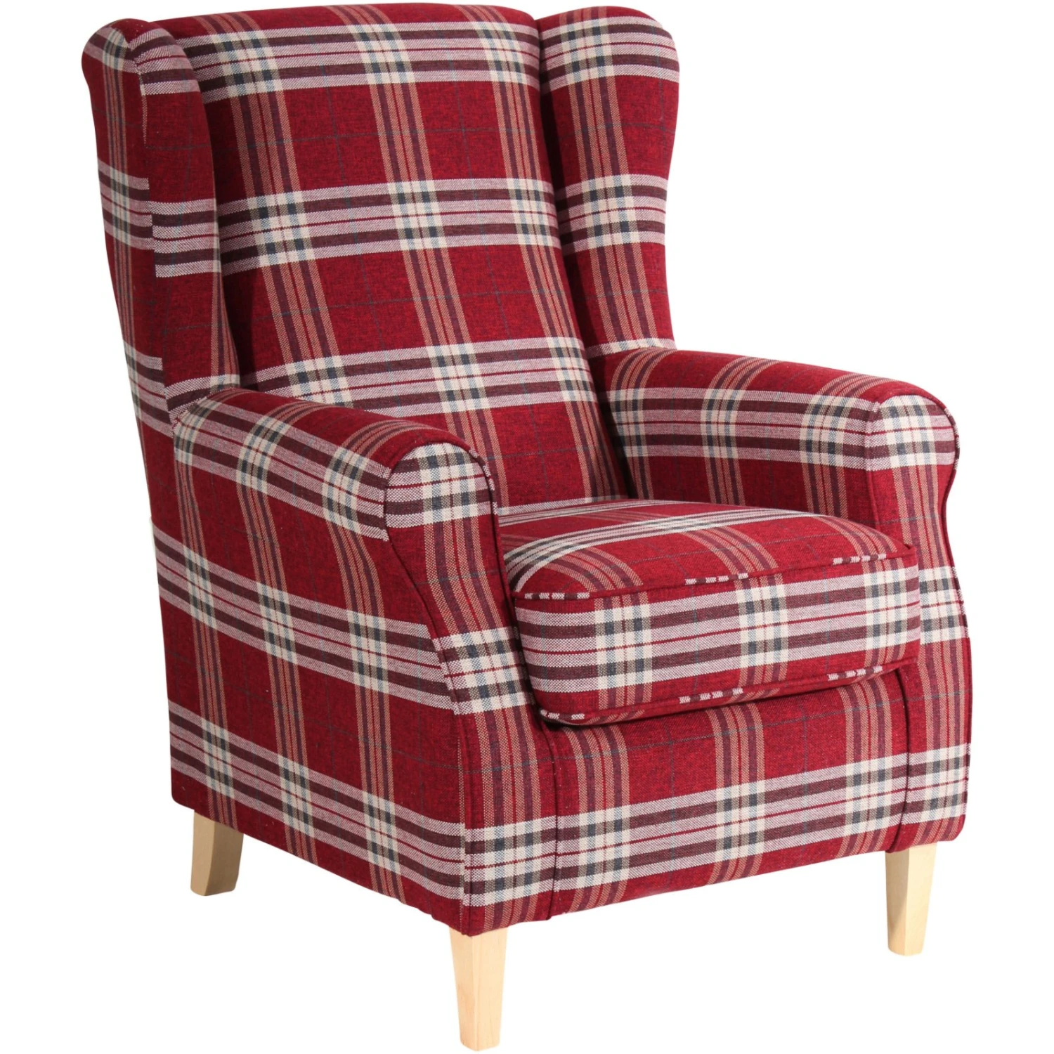 Der Klassiker! Ein bequemer Hochlehnsessel im klassischen Ohrenbackenstil. Dieser karierte Ohrenbackensessel in Rot verzaubert Ihr Wohnzimmer zu einem Highlight. Aufgewertet wird das Modell durch Kedernähte am Sitz und an den harmonisch geschwungenen Armlehnen. Für einen hohen Sitzkomfort sorgt das lose Sitzkissen mit schaumummanteltem Einzelfederkern, das mit Klettverschluss am Korpus befestigt ist. Die Füße in Trapezform sind zur einfachen Selbstmontage.