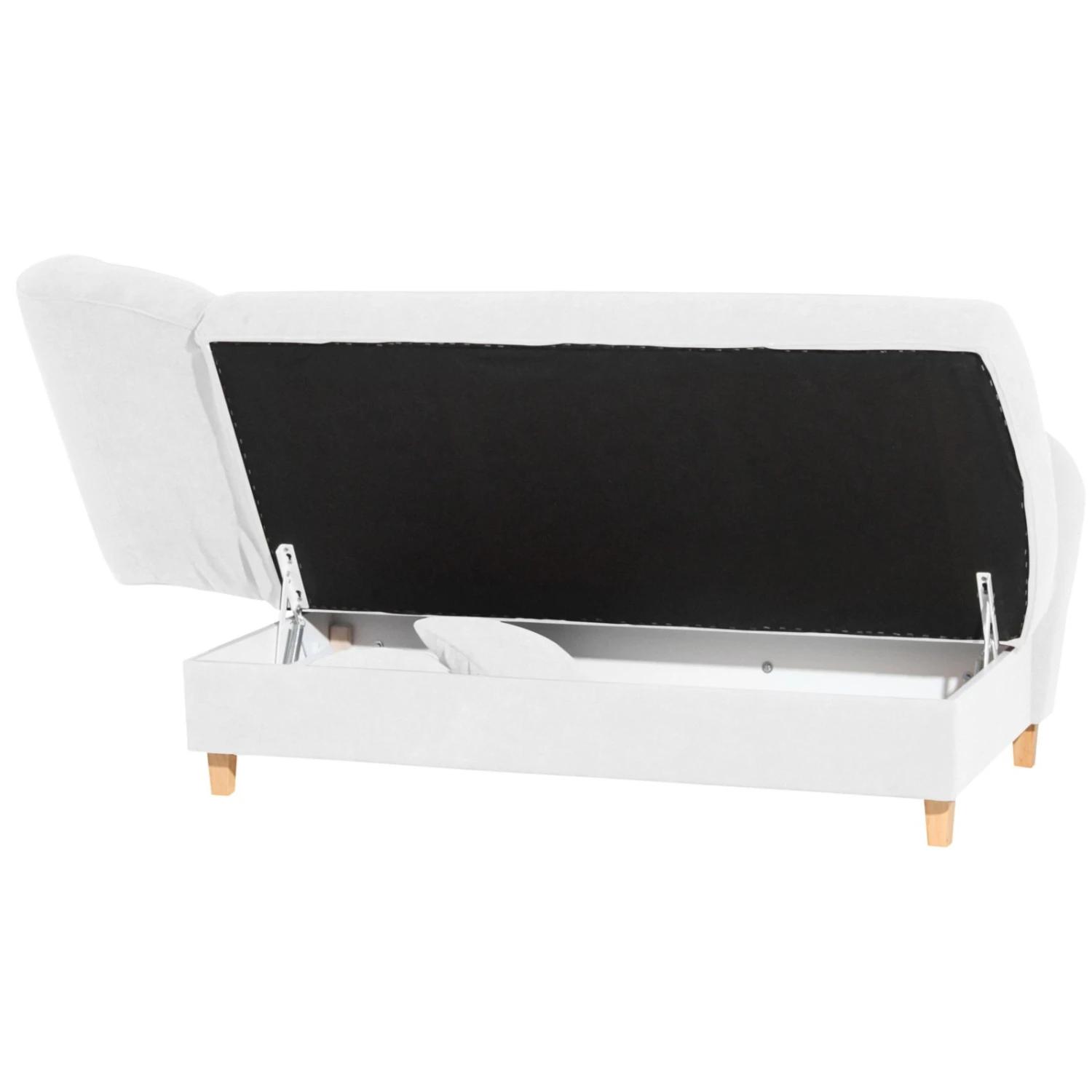 Eine Recamiere – viele Möglichkeiten! Durch die verstellbare Armlehne erhalten Sie Gemütlichkeit in verschiedenen Formen. Nutzen Sie die hochgestellte, um fernzusehen, die eine der mittleren, um einen guten Blick in Ihr Buch zu haben oder klappen Sie die Lehne komplett runter für ein Nickerchen. Die Kissen sind im Lieferumfang enthalten und können schnell und einfach im Staukasten untergebracht werden. Der weiche Bezug ist Veloursstoff in Creme und die Füße in Buche Massivholz machen die Recamiere zusätzlich zur Gemütlichkeit auch zu einem wunderschönen Hingucker.