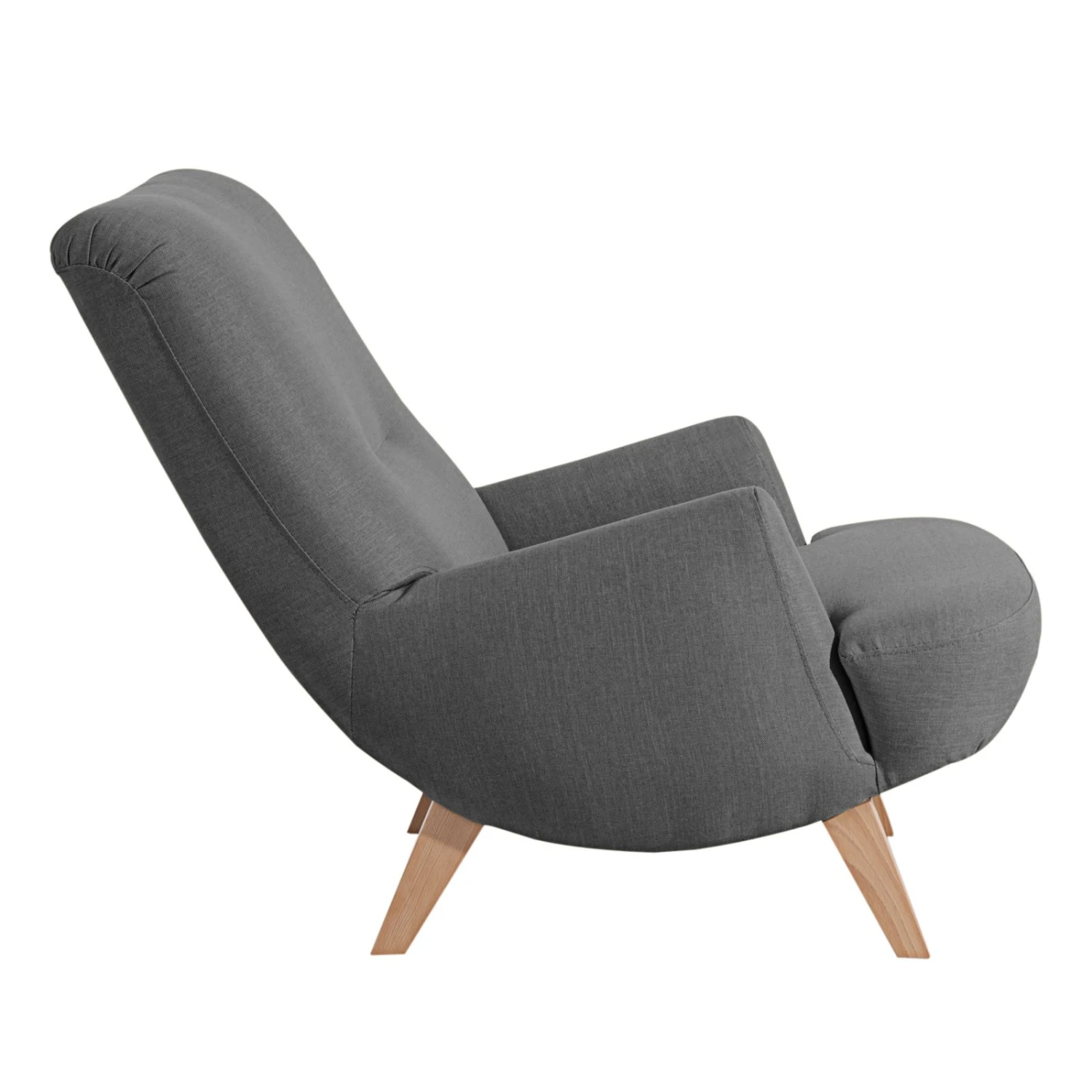 Gemütlicher Sessel in toller Retro-Optik. Hier wird der moderne anthrazitfarbene Bezug in Leinenoptik mit massiven Füßen in Buche natur und einem außergewöhnlichen Design kombiniert. So wird der Sessel in Ihren vier Wänden zum Hingucker. Für Gemütlichkeit ist dank Wellenunterfederung und Polyätherschaum gesorgt. Durch die nach hinten abfallende Sitzfläche können Sie komfortabel Relaxen und schöne Stunden genießen.