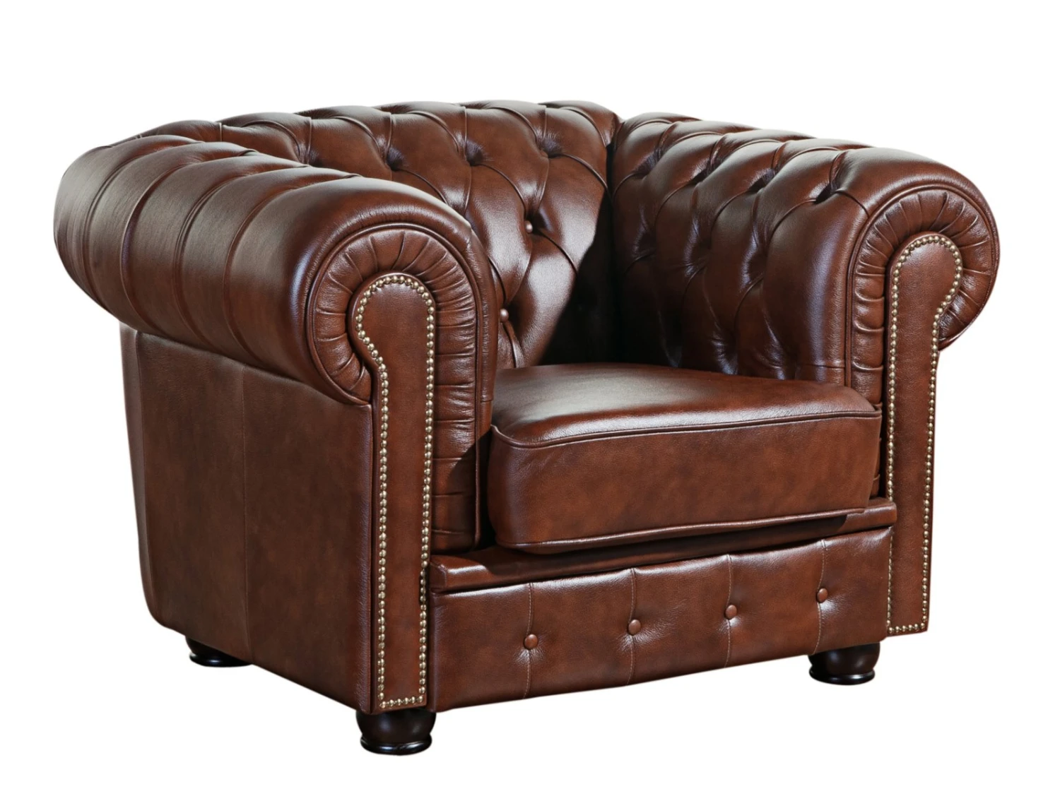 Dekorativ und komfortabel ist dieser Sessel mit seiner aufwändigen Knopfheftung an Rücken, Armlehnen und Sitzleiste. Der Cheserfielstil findet sich nicht nur in der Bearbeitung des braunen Bezugs, sondern auch bei dem losen Sitzkissen wieder, welches mit formstabilem Polyätherschaum gefüllt ist. Als optisches Highlight sind die Armlehnen zusätzlich mit einem Ziernagelband versehen, welches in Kombination mit den gedrechselten Massivholzfüßen eine abgerundete Erscheinung ergibt. Holen Sie sich den englischen Charme in Ihre vier Wände.