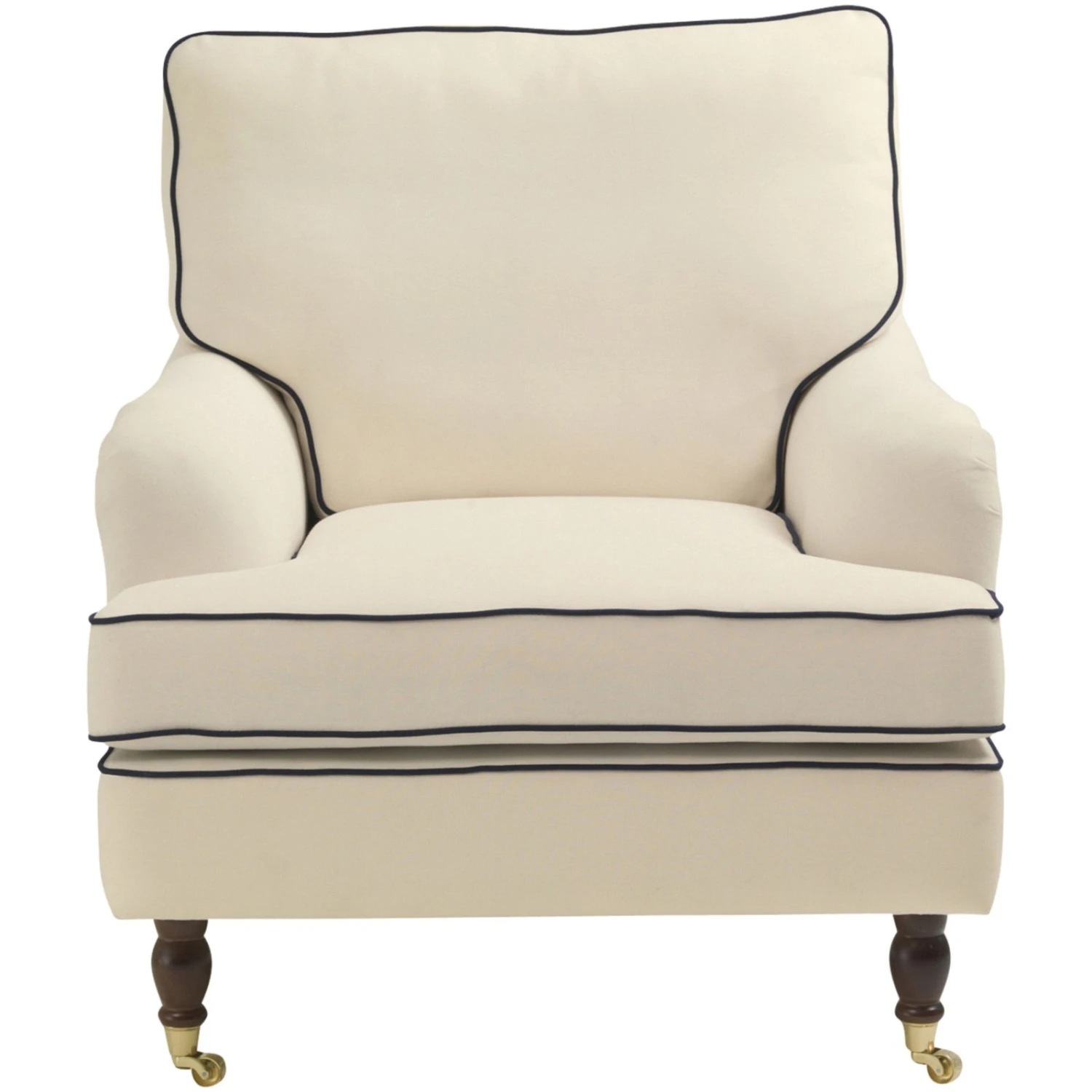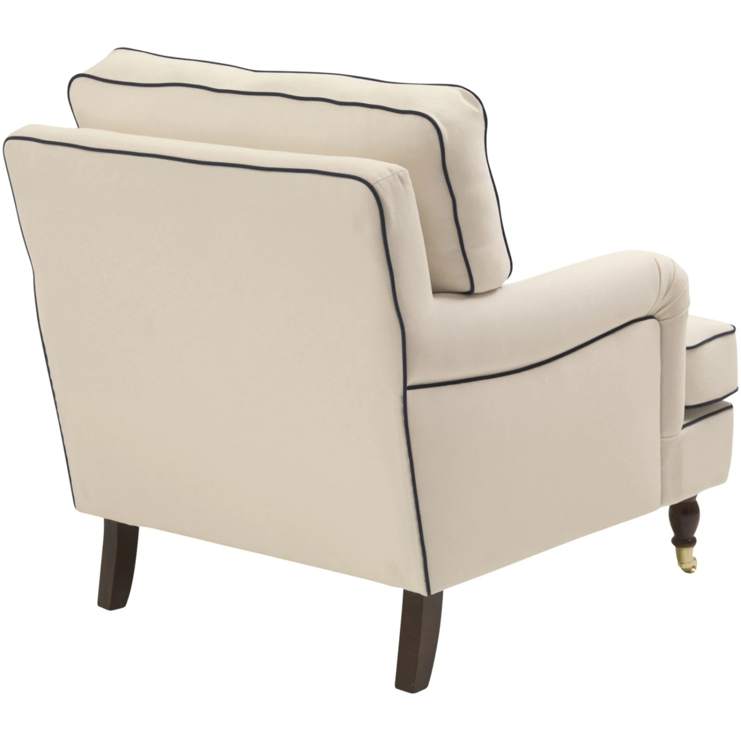 Lehnen Sie sich an und genießen Sie die Gemütlichkeit von Schaumstoffflocken im Rücken von dem üppig gefüllten Kissen. Platz nehmen Sie Auf Wellenunterfederung, die mit Polätherschaum gepolstert wurde und neben Komfort auch das Sitzklima unterstützt. Die geschwungenen Armlehnen und die Tiefe mit ca. 108 cm machen diesen Sessel auch optisch zu einem Highlight. Absoluter Hingucker sind die vorderen Füße, die in handwerklicher Kunst gedrechselt und mit Rollen versehen wurden, so dass sie an Klavierfüße erinnern. Die edle Farbe in dunklem Nussbaum rundet in Kombination mit einem cremefarbenen Bezug mit blauem Keder in Leinenoptik das Gesamtbild ab.