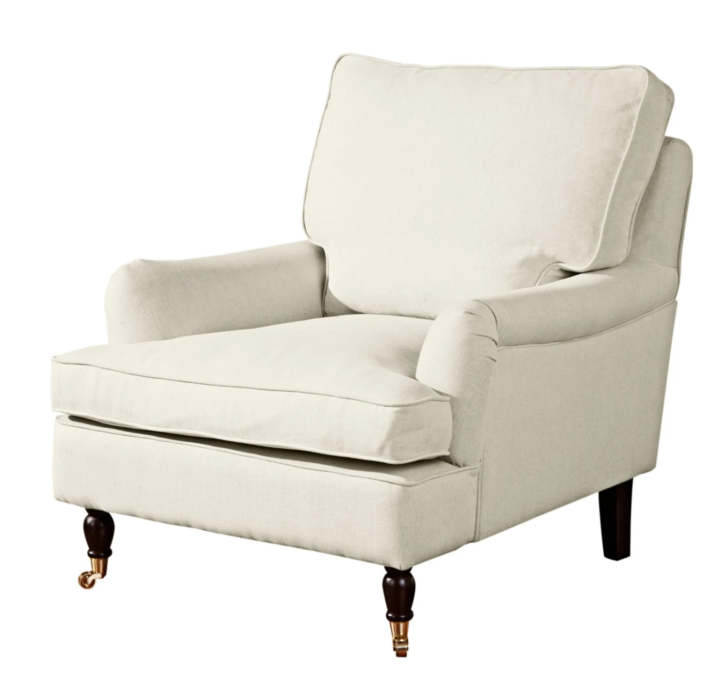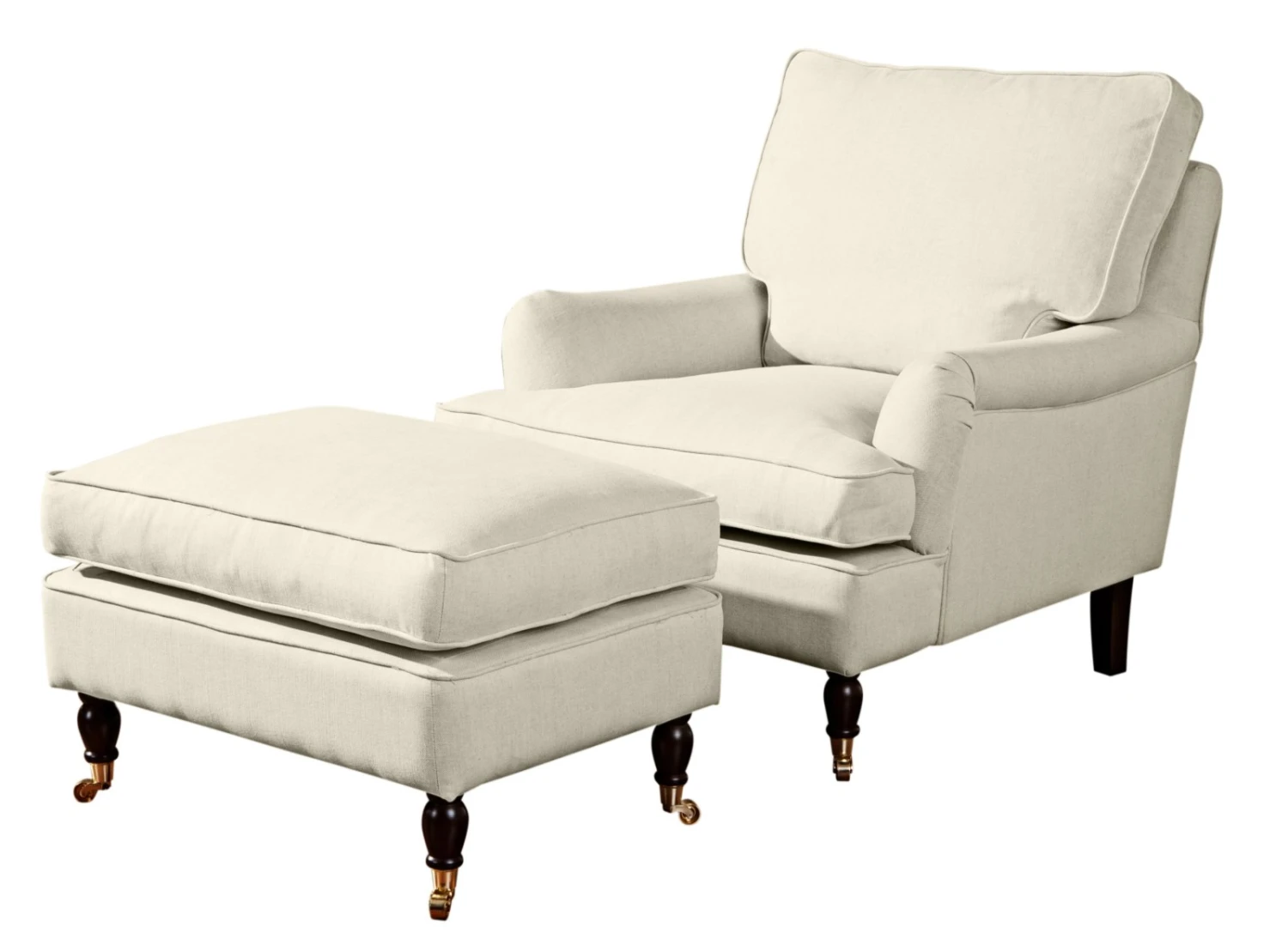 Lehnen Sie sich an und genießen Sie die Gemütlichkeit von Schaumstoffflocken im Rücken von dem üppig gefüllten Kissen. Platz nehmen Sie Auf Wellenunterfederung, die mit Polätherschaum gepolstert wurde und neben Komfort auch das Sitzklima unterstützt. Die geschwungenen Armlehnen und die Tiefe mit ca. 108 cm machen diesen Sessel auch optisch zu einem Highlight. Absoluter Hingucker sind die vorderen Füße, die in handwerklicher Kunst gedrechselt und mit Rollen versehen wurden, so dass sie an Klavierfüße erinnern. Die edle Farbe in dunklem Nussbaum rundet in Kombination mit einem cremefarbenen Bezug in Leinenoptik das Gesamtbild ab.