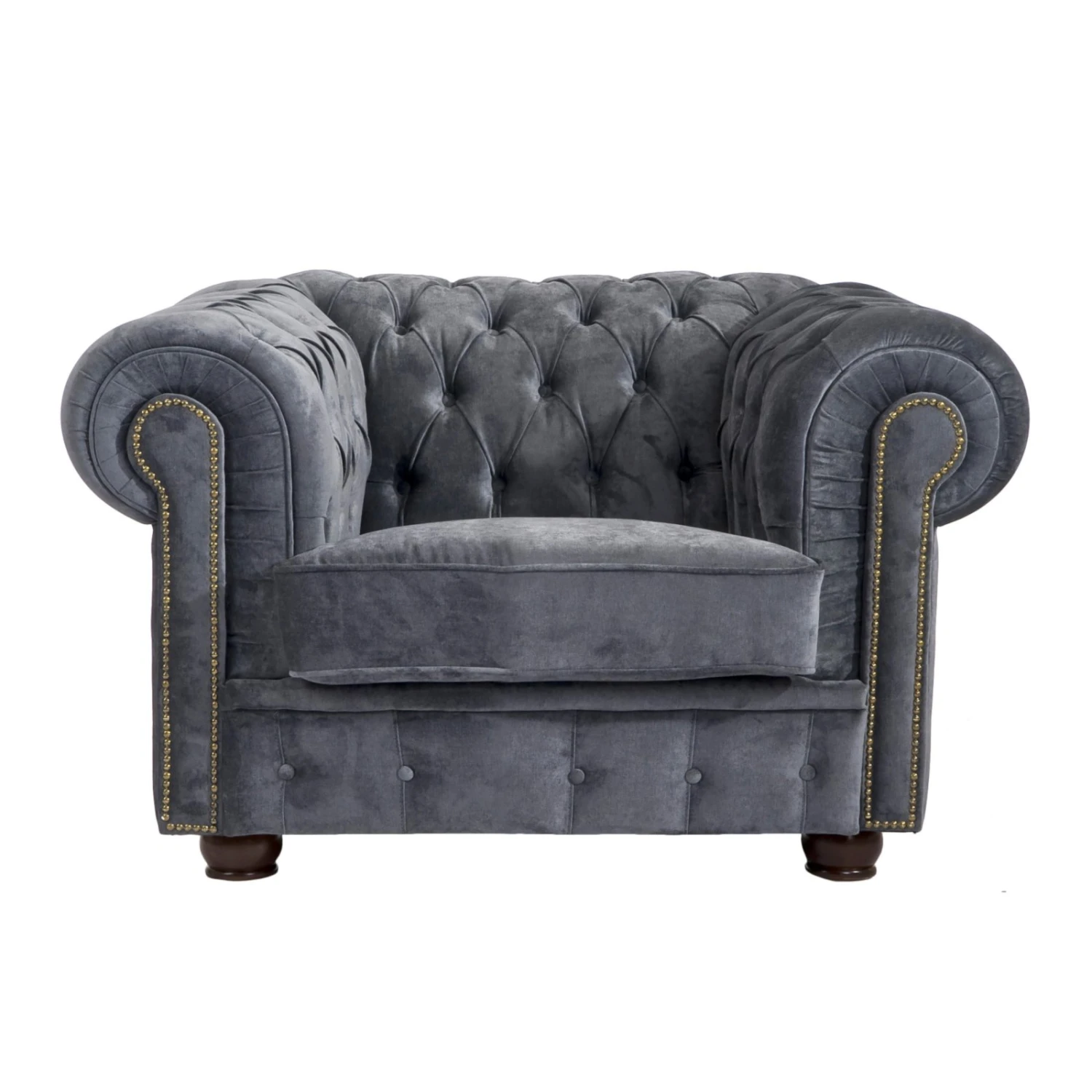 Dekorativ und komfortabel ist dieser Sessel mit seiner aufwändigen Knopfheftung an Rücken, Armlehnen und Sitzleiste. Der Cheserfielstil findet sich nicht nur in der Bearbeitung des grauen Bezugs, sondern auch bei dem losen Sitzkissen wieder, welches mit formstabilem Polyätherschaum gefüllt ist. Als optisches Highlight sind die Armlehnen zusätzlich mit einem Ziernagelband versehen, welches in Kombination mit den gedrechselten Massivholzfüßen eine abgerundete Erscheinung ergibt. Holen Sie sich den englischen Charme in Ihre vier Wände.